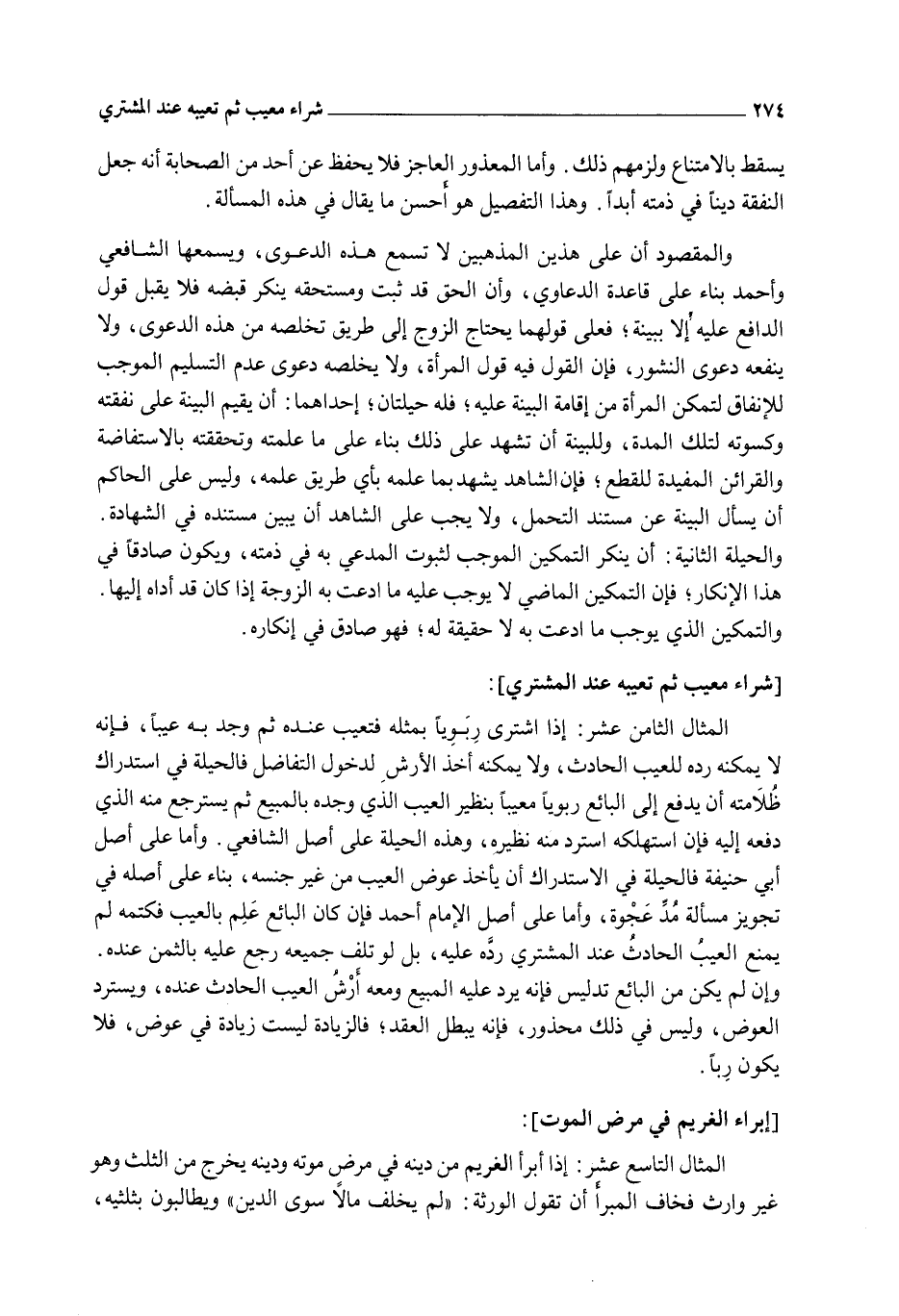 [شِرَاءُ مَعِيبٍ ثُمَّ تَعَيُّبُهُ عِنْدَ الْمُشْتَرِي] : الْمِثَالُ الثَّامِنَ عَشَرَ: إذَا اشْتَرَى رِبَوِيًّا بِمِثْلِهِ فَتَعَيَّبَ عِنْدَهُ ثُمَّ وَجَدَ بِهِ عَيْبًا، فَإِنَّهُ لَا يُمْكِنُهُ رَدُّهُ لِلْعَيْبِ الْحَادِثِ، وَلَا يُمْكِنُهُ أَخْذُ الْأَرْشِ لِدُخُولِ التَّفَاضُلِ فَالْحِيلَةُ فِي اسْتِدْرَاكِ ظُلَامَتِهِ أَنْ يَدْفَعَ إلَى الْبَائِعِ رِبَوِيًّا مَعِيبًا بِنَظِيرِ الْعَيْبِ الَّذِي وَجَدَهُ بِالْمَبِيعِ ثُمَّ يَسْتَرْجِعَ مِنْهُ الَّذِي دَفَعَهُ إلَيْهِ فَإِنْ اسْتَهْلَكَهُ اسْتَرَدَّ مِنْهُ نَظِيرَهُ، وَهَذِهِ الْحِيلَةُ عَلَى أَصْلِ الشَّافِعِيِّ.