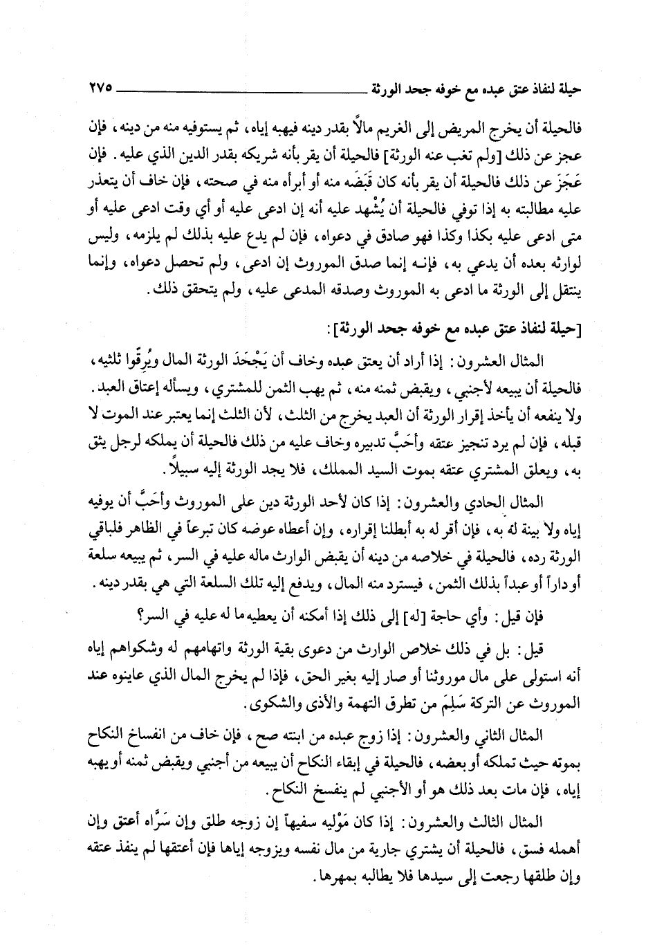 الْمِثَالُ الْعِشْرُونَ: إذَا أَرَادَ أَنْ يُعْتِقَ عَبْدَهُ وَخَافَ أَنْ يَجْحَدَ الْوَرَثَةُ الْمَالَ وَيُرِقُّوا ثُلُثَيْهِ، فَالْحِيلَةُ أَنْ يَبِيعَهُ لِأَجْنَبِيٍّ، وَيَقْبِضَ ثَمَنَهُ مِنْهُ، ثُمَّ يَهَبَ الثَّمَنَ لِلْمُشْتَرِي، وَيَسْأَلَهُ إعْتَاقَ الْعَبْدِ. وَلَا يَنْفَعُهُ أَنْ يَأْخُذَ إقْرَارَ الْوَرَثَةِ أَنَّ الْعَبْدَ يَخْرُجُ مِنْ الثُّلُثِ؛ لِأَنَّ الثُّلُثَ إنَّمَا يُعْتَبَرُ عِنْدَ الْمَوْتِ لَا قَبْلَهُ، فَإِنْ لَمْ يُرِدْ تَنْجِيزَ عِتْقِهِ وَأَحَبَّ تَدْبِيرَهُ وَخَافَ عَلَيْهِ مِنْ ذَلِكَ فَالْحِيلَةُ أَنْ يُمَلِّكَهُ لِرَجُلٍ يَثِقُ بِهِ، وَيُعَلِّقُ الْمُشْتَرِي عِتْقَهُ بِمَوْتِ السَّيِّدِ الْمُمَلِّكِ، فَلَا يَجِدُ الْوَرَثَةُ إلَيْهِ سَبِيلًا