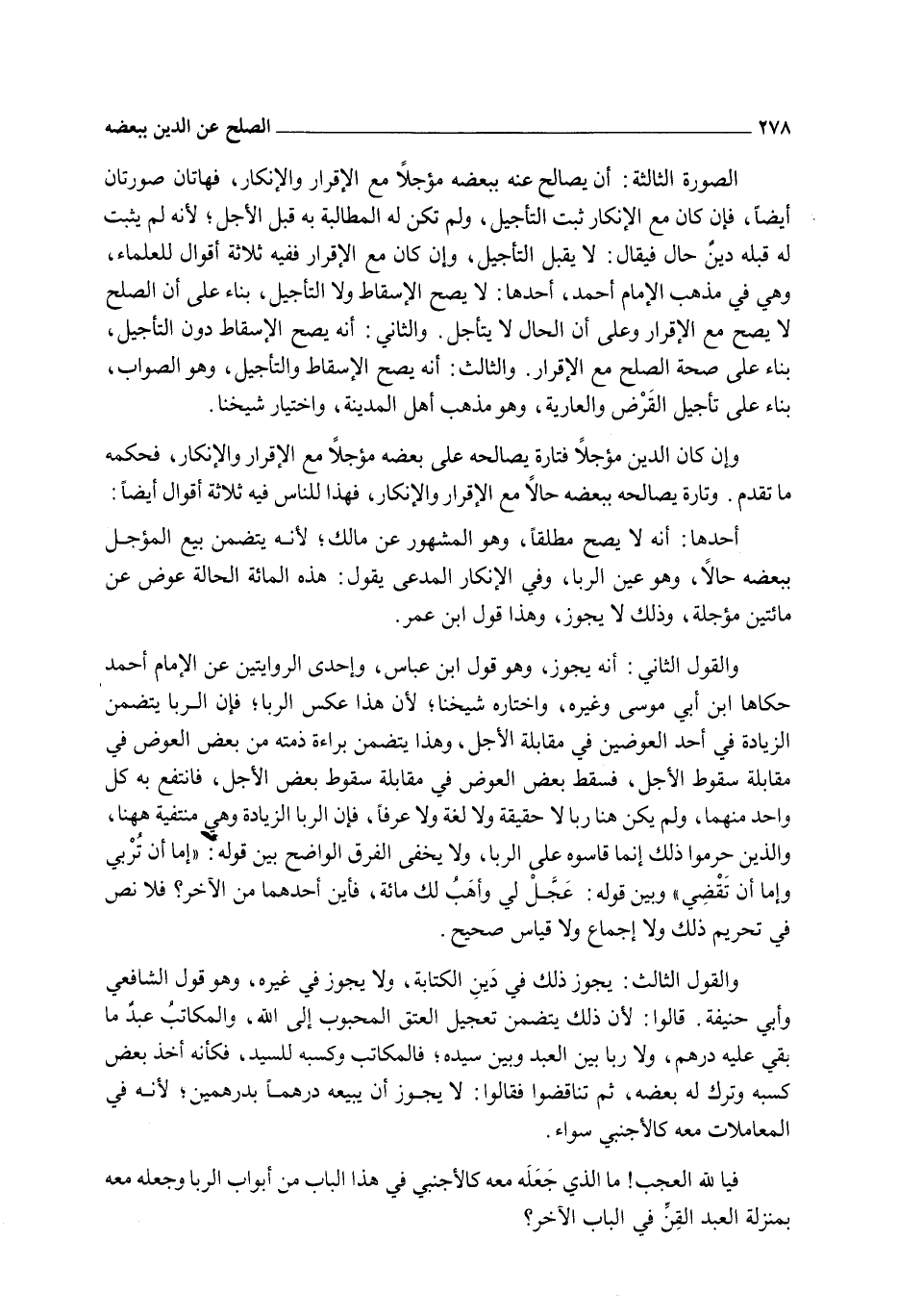 وَإِنْ كَانَ الدَّيْنُ مُؤَجَّلًا فَتَارَةً يُصَالِحُهُ عَلَى بَعْضِهِ مُؤَجَّلًا مَعَ الْإِقْرَارِ وَالْإِنْكَارِ، فَحُكْمُهُ مَا تَقَدَّمَ. وَتَارَةً يُصَالِحُهُ بِبَعْضِهِ حَالًّا مَعَ الْإِقْرَارِ وَالْإِنْكَارِ، فَهَذَا لِلنَّاسِ فِيهِ ثَلَاثَةُ أَقْوَالٍ أَيْضًا: أَحَدُهَا: أَنَّهُ لَا يَصِحُّ مُطْلَقًا، وَهُوَ الْمَشْهُورُ عَنْ مَالِكٍ؛ لِأَنَّهُ يَتَضَمَّنُ بَيْعَ الْمُؤَجَّلِ بِبَعْضِهِ حَالًّا، وَهُوَ عَيْنُ الرِّبَا، وَفِي الْإِنْكَارِ الْمُدَّعِي يَقُولُ: هَذِهِ الْمِائَةُ الْحَالَّةُ عِوَضٌ عَنْ مِائَتَيْنِ مُؤَجَّلَةٍ، وَذَلِكَ لَا يَجُوزُ، وَهَذَا قَوْلُ ابْنِ عُمَرَ. وَالْقَوْلُ الثَّانِي أَنَّهُ يَجُوزُ، وَهُوَ قَوْلُ ابْنِ عَبَّاسٍ، وَإِحْدَى الرِّوَايَتَيْنِ عَنْ الْإِمَامِ أَحْمَدَ حَكَاهَا ابْنُ أَبِي مُوسَى وَغَيْرُهُ، وَاخْتَارَهُ شَيْخُنَا؛ لِأَنَّ هَذَا عَكْسُ الرِّبَا؛ فَإِنَّ الرِّبَا يَتَضَمَّنُ الزِّيَادَةَ فِي أَحَدِ الْعِوَضَيْنِ فِي مُقَابَلَةِ الْأَجَلِ، وَهَذَا يَتَضَمَّنُ بَرَاءَةَ ذِمَّتِهِ مِنْ بَعْضِ الْعِوَضِ فِي مُقَابَلَةِ سُقُوطِ الْأَجَلِ، فَسَقَطَ بَعْضُ الْعِوَضِ فِي مُقَابَلَةِ سُقُوطِ بَعْضِ الْأَجَلِ، فَانْتَفَعَ بِهِ كُلُّ وَاحِدٍ مِنْهُمَا، وَلَمْ يَكُنْ هُنَا رِبًا لَا حَقِيقَةً وَلَا لُغَةً وَلَا عُرْفًا، فَإِنَّ الرِّبَا الزِّيَادَةُ وَهِيَ مُنْتَفِيَةٌ هَهُنَا، وَاَلَّذِينَ حَرَّمُوا ذَلِكَ إنَّمَا قَاسُوهُ عَلَى الرِّبَا، وَلَا يَخْفَى الْفَرْقُ الْوَاضِحُ بَيْنَ قَوْلِهِ: " إمَّا أَنْ تُرْبِيَ وَإِمَّا أَنْ تَقْضِيَ " وَبَيْنَ قَوْلِهِ: عَجِّلْ لِي وَأَهَبُ لَك مِائَةً، فَأَيْنَ أَحَدُهُمَا مِنْ الْآخَرِ؟ فَلَا نَصَّ فِي تَحْرِيمِ ذَلِكَ وَلَا إجْمَاعَ وَلَا قِيَاسَ صَحِيحٌ.
