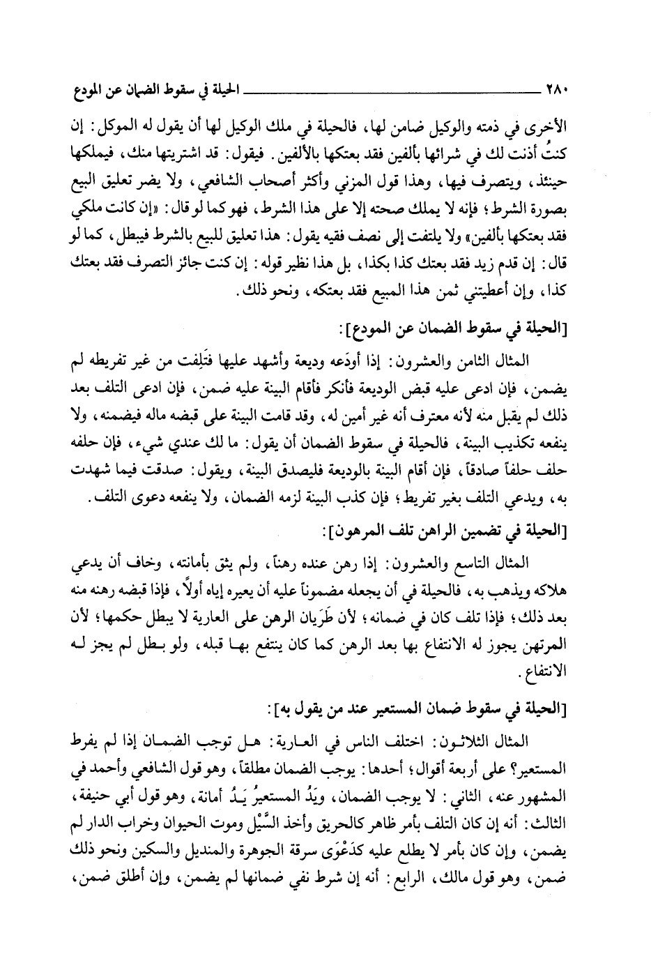 [الْحِيلَةٌ فِي سُقُوطِ الضَّمَانِ عَنْ الْمُودِعِ] : الْمِثَالُ الثَّامِنُ وَالْعِشْرُونَ: إذَا أَوْدَعَهُ وَدِيعَةً وَأَشْهَدَ عَلَيْهَا فَتَلِفَتْ مِنْ غَيْرِ تَفْرِيطِهِ لَمْ يَضْمَنْ، فَإِنْ ادَّعَى عَلَيْهِ قَبْضَ الْوَدِيعَةِ فَأَنْكَرَ فَأَقَامَ الْبَيِّنَةَ عَلَيْهِ ضَمِنَ، فَإِنْ ادَّعَى التَّلَفَ بَعْدَ ذَلِكَ لَمْ يُقْبَلْ مِنْهُ؛ لِأَنَّهُ مُعْتَرِفٌ أَنَّهُ غَيْرُ أَمِينٍ لَهُ، وَقَدْ قَامَتْ الْبَيِّنَةُ عَلَى قَبْضِهِ مَالَهُ فَيَضْمَنُهُ، وَلَا يَنْفَعُهُ تَكْذِيبُ الْبَيِّنَةِ، فَالْحِيلَةُ فِي سُقُوطِ الضَّمَانِ أَنْ يَقُولَ: مَا لَك عِنْدِي شَيْءٌ، فَإِنْ حَلَّفَهُ حَلَفَ حَلِفًا صَادِقًا، فَإِنْ أَقَامَ الْبَيِّنَةَ الْوَدِيعَةِ فَلْيُصَدِّقْ الْبَيِّنَةَ، وَيَقُولُ: صَدَقْت فِيمَا شَهِدْت بِهِ، وَيَدَّعِي التَّلَفَ بِغَيْرِ تَفْرِيطٍ؛ فَإِنْ كَذَّبَ الْبَيِّنَةَ لَزِمَهُ الضَّمَانُ، وَلَا يَنْفَعُهُ دَعْوَى التَّلَفِ.
