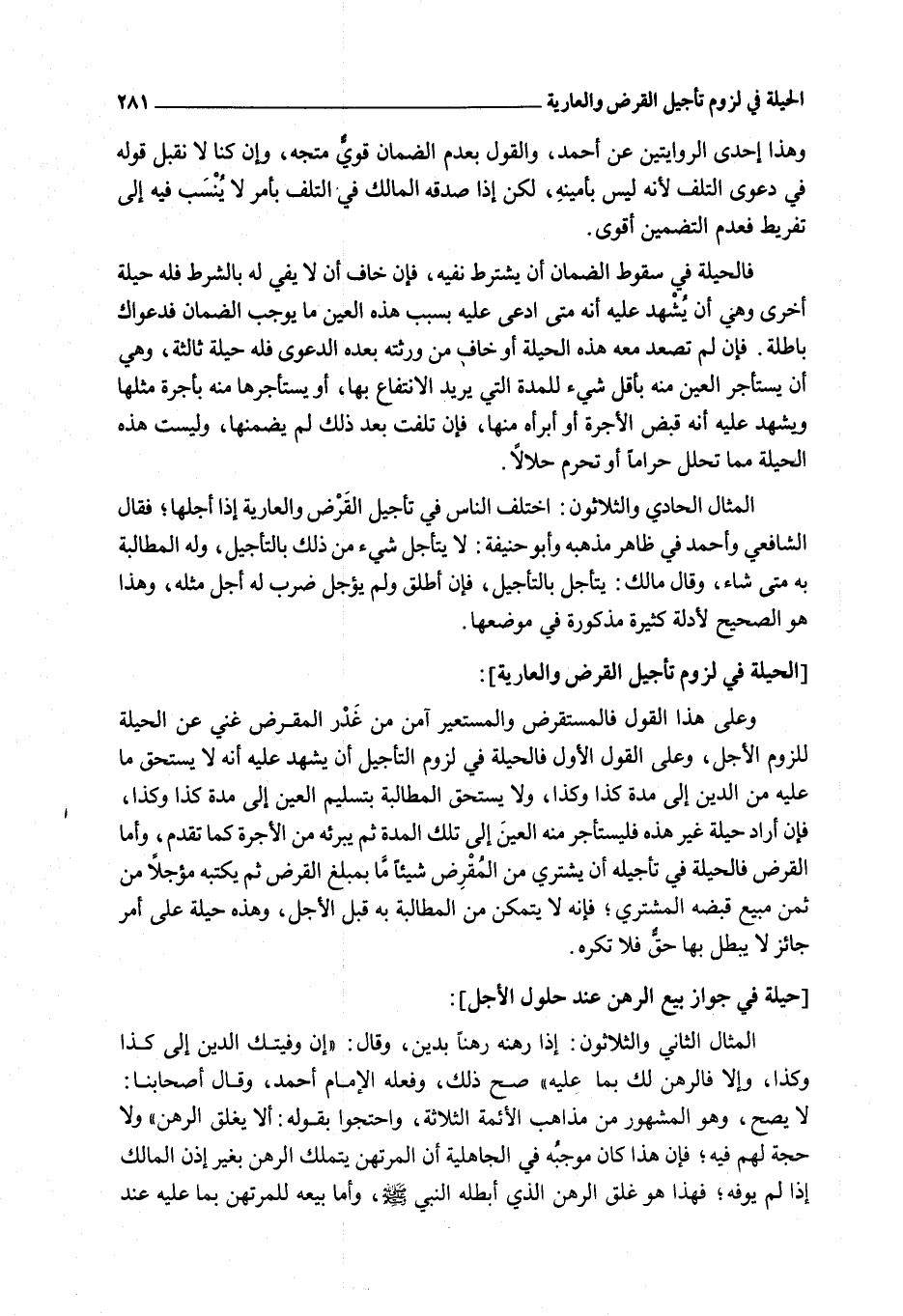 [الْحِيلَةٌ فِي لُزُومِ تَأْجِيلِ الْقَرْضِ وَالْعَارِيَّةِ] : وَعَلَى هَذَا الْقَوْلِ فَالْمُسْتَقْرِضُ وَالْمُسْتَعِيرُ آمِنٌ مِنْ غَدْرِ الْمُقْرِضِ غَنِيٌّ عَنْ الْحِيلَةِ لِلُّزُومِ الْأَجَلِ، وَعَلَى الْقَوْلِ الْأَوَّلِ فَالْحِيلَةُ فِي لُزُومِ التَّأْجِيلِ أَنْ يُشْهِدَ عَلَيْهِ أَنَّهُ لَا يَسْتَحِقُّ مَا عَلَيْهِ مِنْ الدَّيْنِ إلَى مُدَّةِ كَذَا وَكَذَا، وَلَا يَسْتَحِقُّ الْمُطَالَبَةَ بِتَسْلِيمِ الْعَيْنِ إلَى مُدَّةِ كَذَا وَكَذَا، فَإِنْ أَرَادَ حِيلَةً غَيْرَ هَذِهِ فَلْيَسْتَأْجِرْ مِنْهُ الْعَيْنَ إلَى تِلْكَ الْمُدَّةِ ثُمَّ يُبْرِئْهُ مِنْ الْأُجْرَةِ كَمَا تَقَدَّمَ، وَأَمَّا الْقَرْضُ فَالْحِيلَةُ فِي تَأْجِيلِهِ أَنْ يَشْتَرِيَ مِنْ الْمُقْرِضِ شَيْئًا مَا بِمَبْلَغِ الْقَرْضِ ثُمَّ يَكْتُبَهُ مُؤَجَّلًا مِنْ ثَمَنِ مَبِيعٍ قَبَضَهُ الْمُشْتَرِي؛ فَإِنَّهُ لَا يَتَمَكَّنُ مِنْ الْمُطَالَبَةِ بِهِ قَبْلَ الْأَجَلِ، وَهَذِهِ حِيلَةٌ عَلَى أَمْرٍ جَائِزٍ لَا يَبْطُلُ بِهَا حَقٌّ فَلَا تُكْرَهُ.