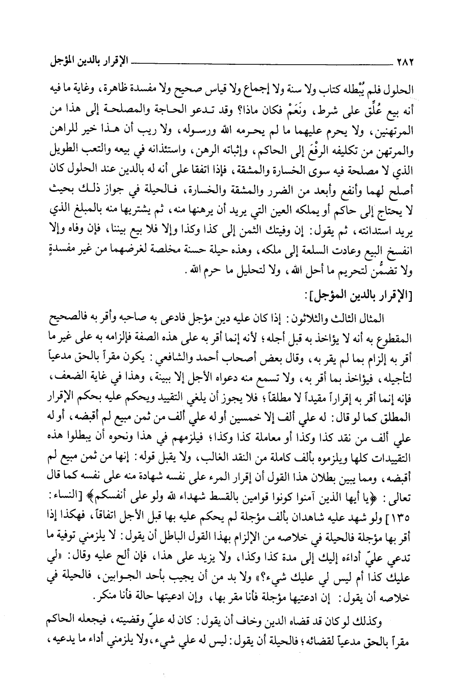 الْمِثَالُ الثَّالِثُ وَالثَّلَاثُونَ: إذَا كَانَ عَلَيْهِ دَيْنٌ مُؤَجَّلٌ فَادَّعَى بِهِ صَاحِبُهُ وَأَقَرَّ بِهِ فَالصَّحِيحُ الْمَقْطُوعُ بِهِ أَنَّهُ لَا يُؤَاخَذُ بِهِ قَبْلَ أَجَلِهِ؛ لِأَنَّهُ إنَّمَا أَقَرَّ بِهِ عَلَى هَذِهِ الصِّفَةِ فَإِلْزَامُهُ بِهِ عَلَى غَيْرِ مَا أَقَرَّ بِهِ إلْزَامٌ بِمَا لَمْ يُقِرَّ بِهِ، وَقَالَ بَعْضُ أَصْحَابِ أَحْمَدَ وَالشَّافِعِيِّ: يَكُونُ مُقِرًّا بِالْحَقِّ مُدَّعِيًا لِتَأْجِيلِهِ، فَيُؤَاخَذُ بِمَا أَقَرَّ بِهِ، وَلَا تُسْمَعُ مِنْهُ دَعْوَاهُ الْأَجَلَ إلَّا بِبَيِّنَةٍ، وَهَذَا فِي غَايَةِ الضَّعْفِ، فَإِنَّهُ إنَّمَا أَقَرَّ بِهِ إقْرَارًا مُقَيَّدًا لَا مُطْلَقًا؛ فَلَا يَجُوزُ أَنْ يُلْغِيَ التَّقْيِيدَ وَيَحْكُمَ عَلَيْهِ بِحُكْمِ الْإِقْرَارِ الْمُطْلَقِ كَمَا لَوْ قَالَ: لَهُ عَلَيَّ أَلْفٌ إلَّا خَمْسِينَ أَوْ لَهُ عَلَيَّ أَلْفٌ مِنْ ثَمَنِ مَبِيعٍ لَمْ أَقْبِضْهُ، أَوْ لَهُ عَلَيَّ أَلْفٌ مِنْ نَقْدِ كَذَا وَكَذَا أَوْ مُعَامَلَةِ كَذَا وَكَذَا؛ فَيَلْزَمُهُمْ فِي هَذَا وَنَحْوِهِ أَنْ يُبْطِلُوا هَذِهِ التَّقْيِيدَاتِ كُلَّهَا وَيُلْزِمُوهُ بِأَلْفٍ كَامِلَةٍ مِنْ النَّقْدِ الْغَالِبِ، وَلَا يُقْبَلُ قَوْلُهُ: إنَّهَا مِنْ ثَمَنِ مَبِيعٍ لَمْ أَقْبِضْهُ، وَمِمَّا يُبَيِّنُ بُطْلَانَ هَذَا الْقَوْلِ أَنَّ إقْرَارَ الْمَرْءِ عَلَى نَفْسِهِ شَهَادَةٌ مِنْهُ عَلَى نَفْسِهِ كَمَا قَالَ تَعَالَى: {يَا أَيُّهَا الَّذِينَ آمَنُوا كُونُوا قَوَّامِينَ بِالْقِسْطِ شُهَدَاءَ لِلَّهِ وَلَوْ عَلَى أَنْفُسِكُمْ} [النساء: 135] .