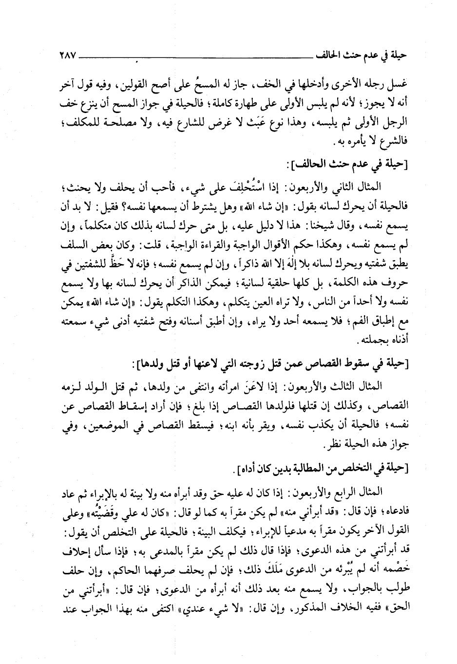 الْمِثَالُ الثَّانِي وَالْأَرْبَعُونَ: إذَا اُسْتُحْلِفَ عَلَى شَيْءٍ، فَأَحَبَّ أَنْ يَحْلِفَ وَلَا يَحْنَثَ؛ فَالْحِيلَةُ أَنْ يُحَرِّكَ لِسَانَهُ بِقَوْلِ: " إنْ شَاءَ اللَّهُ " وَهَلْ يُشْتَرَطُ أَنْ يُسْمِعَهَا نَفْسَهُ؟ فَقِيلَ: لَا بُدَّ أَنْ يُسْمِعَ نَفْسَهُ، وَقَالَ شَيْخُنَا: هَذَا لَا دَلِيلَ عَلَيْهِ، بَلْ مَتَى حَرَّكَ لِسَانَهُ بِذَلِكَ كَانَ مُتَكَلِّمًا، وَإِنْ لَمْ يُسْمِعْ نَفْسَهُ، وَهَكَذَا حُكْمُ الْأَقْوَالِ الْوَاجِبَةِ وَالْقِرَاءَةِ الْوَاجِبَةِ، قُلْت: وَكَانَ بَعْضُ السَّلَفِ يُطْبِقُ شَفَتَيْهِ وَيُحَرِّكُ لِسَانَهُ بِلَا إلَهَ إلَّا اللَّهُ ذَاكِرًا، وَإِنْ لَمْ يُسْمِعْ نَفْسَهُ؛ فَإِنَّهُ لَا حَظَّ لِلشَّفَتَيْنِ فِي حُرُوفِ هَذِهِ الْكَلِمَةِ، بَلْ كُلُّهَا حَلْقِيَّةٌ لِسَانِيَّةٌ؛ فَيُمْكِنُ الذَّاكِرُ أَنْ يُحَرِّكَ لِسَانَهُ بِهَا وَلَا يُسْمِعَ نَفْسَهُ وَلَا أَحَدًا مِنْ النَّاسِ، وَلَا تَرَاهُ الْعَيْنُ يَتَكَلَّمُ، وَهَكَذَا التَّكَلُّمُ يَقُولُ: " إنْ شَاءَ اللَّهُ " يُمْكِنُ مَعَ إطْبَاقِ الْفَمِ؛ فَلَا يَسْمَعُهُ أَحَدٌ وَلَا يَرَاهُ، وَإِنْ أَطْبَقَ أَسْنَانَهُ وَفَتَحَ شَفَتَيْهِ أَدْنَى شَيْءٍ سَمِعَتْهُ أُذُنَاهُ بِجُمْلَتِهِ.