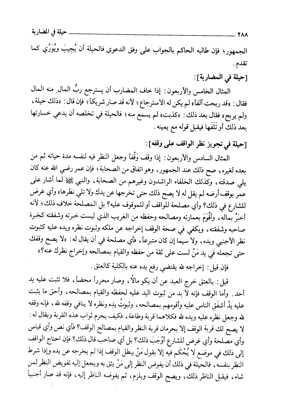 الْمِثَالُ الْخَامِسُ وَالْأَرْبَعُونَ: إذَا خَافَ الْمُضَارِبُ أَنْ يَسْتَرْجِعَ رَبُّ الْمَالِ مِنْهُ الْمَالَ فَقَالَ: " قَدْ رَبِحْت أَلْفًا " لَمْ يَكُنْ لَهُ الِاسْتِرْجَاعُ؛ لِأَنَّهُ قَدْ صَارَ شَرِيكًا؛ فَإِنْ قَالَ: " ذَلِكَ حِيلَةٌ، وَلَمْ يَرْبَحْ " فَقَالَ بَعْدَ ذَلِكَ: " كَذَبْت " لَمْ يُسْمَعْ مِنْهُ؛ فَالْحِيلَةُ فِي تَخَلُّصِهِ أَنْ يَدَّعِيَ خَسَارَتهَا بَعْدِ ذَلِكَ أَوْ تَلَفَهَا فَيُقْبَلُ قَوْلُهُ مَعَ يَمِينِهِ.