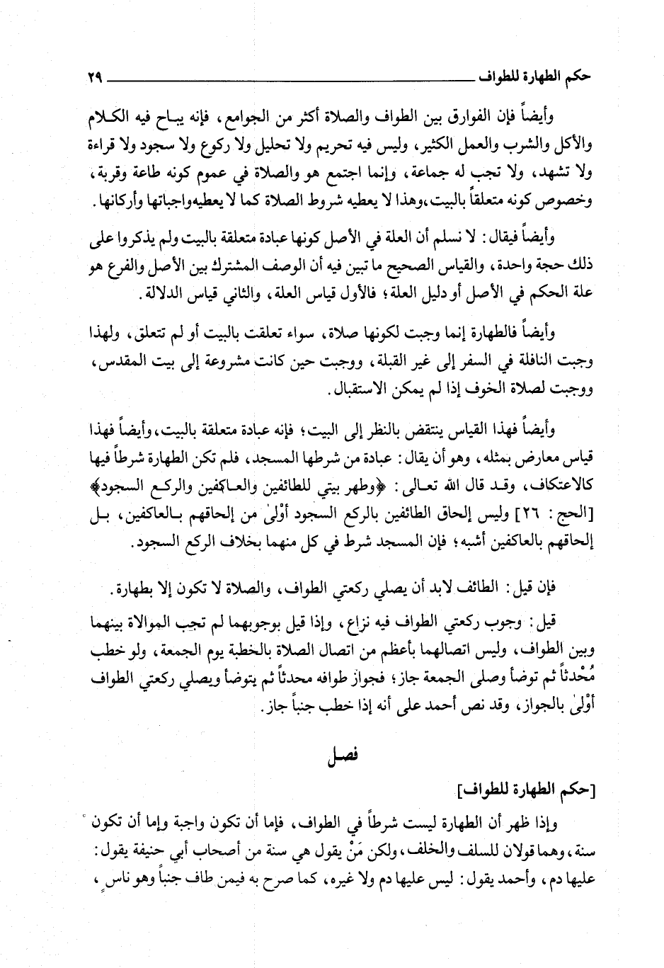 وَأَيْضًا فَهَذَا الْقِيَاسُ يُنْتَقَضُ بِالنَّظَرِ إلَى الْبَيْتِ؛ فَإِنَّهُ عِبَادَةٌ مُتَعَلِّقَةٌ بِالْبَيْتِ، وَأَيْضًا فَهَذَا قِيَاسٌ مُعَارَضٌ بِمِثْلِهِ، وَهُوَ أَنْ يُقَالَ: عِبَادَةٌ مِنْ شَرْطِهَا الْمَسْجِدُ، فَلَمْ تَكُنْ الطَّهَارَةُ شَرْطًا فِيهَا كَالِاعْتِكَافِ، وَقَدْ قَالَ اللَّهُ تَعَالَى: {أَنْ طَهِّرَا بَيْتِيَ لِلطَّائِفِينَ وَالْعَاكِفِينَ وَالرُّكَّعِ السُّجُودِ} [البقرة: 125] وَلَيْسَ إلْحَاقُ الطَّائِفِينَ بِالرُّكَّعِ السُّجُودِ أَوْلَى مِنْ إلْحَاقِهِمْ بِالْعَاكِفِينَ، بَلْ إلْحَاقُهُمْ بِالْعَاكِفِينَ أَشْبَهُ؛ فَإِنَّ الْمَسْجِدَ شَرْطٌ فِي كُلِّ مِنْهُمَا بِخِلَافِ الرُّكَّعِ السُّجُودِ.