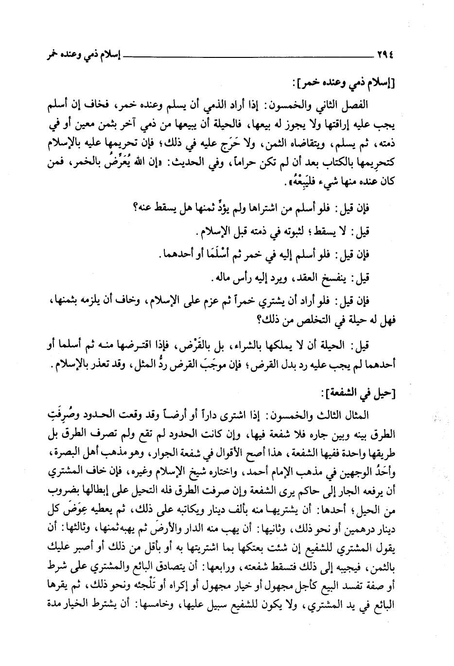 الْفَصْلُ الثَّانِي وَالْخَمْسُونَ: إذَا أَرَادَ الذِّمِّيُّ أَنْ يُسْلِمَ وَعِنْدَهُ خَمْرٌ، فَخَافَ إنْ أَسْلَمَ، يَجِبُ عَلَيْهِ إرَاقَتُهَا وَلَا يَجُوزُ لَهُ بَيْعُهَا، فَالْحِيلَةُ أَنْ يَبِيعَهَا مِنْ ذِمِّيٍّ آخَرَ بِثَمَنٍ مُعَيَّنٍ أَوْ فِي ذِمَّتِهِ، ثُمَّ يُسْلِمَ، وَيَتَقَاضَاهُ الثَّمَنَ، وَلَا حَرَجَ عَلَيْهِ فِي ذَلِكَ؛ فَإِنَّ تَحْرِيمَهَا عَلَيْهِ بِالْإِسْلَامِ كَتَحْرِيمِهَا بِالْكِتَابِ بَعْدَ أَنْ لَمْ تَكُنْ حَرَامًا، وَفِي الْحَدِيثِ: «إنَّ اللَّهَ يُعَرِّضُ بِالْخَمْرِ، فَمَنْ كَانَ عِنْدَهُ مِنْهَا شَيْءٌ فَلْيَبِعْهُ» .