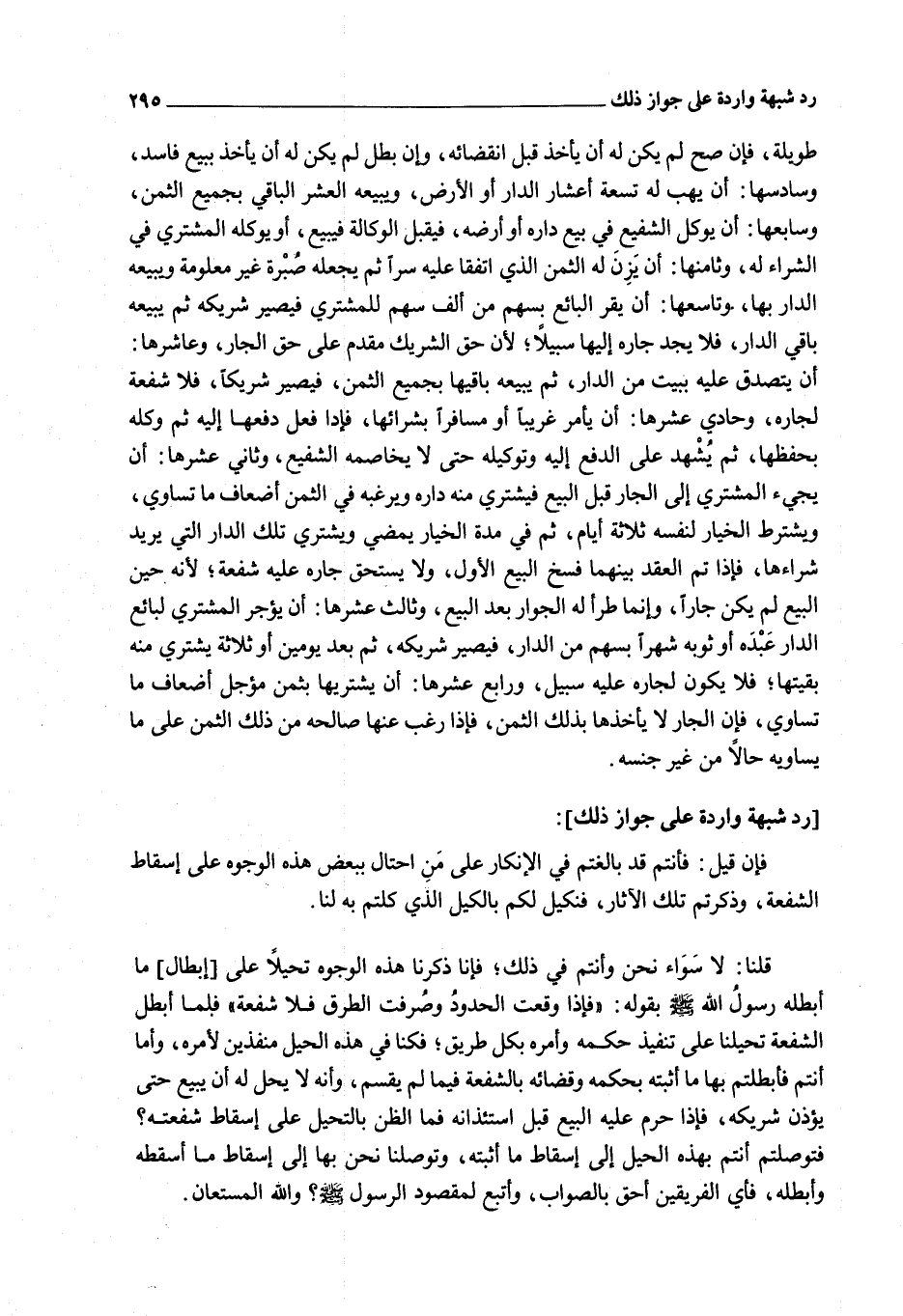 فَإِنْ قِيلَ: فَأَنْتُمْ قَدْ بَالَغْتُمْ مِنْ الْإِنْكَارِ عَلَى مَنْ احْتَالَ بِبَعْضِ هَذِهِ الْوُجُوهِ عَلَى إسْقَاطِ الشُّفْعَةِ، وَذَكَرْتُمْ تِلْكَ الْآثَارَ، فَنَكِيلُ لَكُمْ بِالْكَيْلِ الَّذِي كِلْتُمْ بِهِ لَنَا.