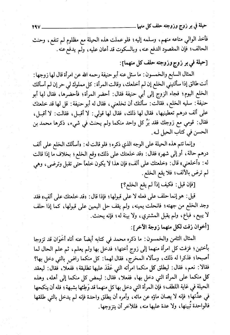الْمِثَالُ السَّابِعُ وَالْخَمْسُونَ: مَا سُئِلَ عَنْهُ أَبُو حَنِيفَةَ - رَحِمَهُ اللَّهُ - عَنْ امْرَأَةٍ قَالَ لَهَا زَوْجُهَا: أَنْتِ طَالِقٌ إذَا سَأَلْتَينِي الْخُلْعَ إنْ لَمْ أَخْلَعْك، وَقَالَتْ الْمَرْأَةُ: كُلُّ مَمْلُوكٍ لِي حُرٌّ إنْ لَمْ أَسْأَلْك الْخَلْع الْيَوْمَ؛ فَجَاءَ الزَّوْجُ إلَى أَبِي حَنِيفَةَ فَقَالَ: أَحْضِرْ الْمَرْأَةَ؛ فَأَحْضَرَهَا، فَقَالَ لَهَا أَبُو حَنِيفَةَ: سَلِيهِ الْخُلْعَ، فَقَالَتْ: سَأَلَتْك أَنْ تَخْلَعَنِي، فَقَالَ لَهُ أَبُو حَنِيفَةَ: قُلْ لَهَا قَدْ خَلَعْتُك عَلَى أَلْفِ دِرْهَمٍ تُعْطِينِيهَا، فَقَالَ لَهَا ذَلِكَ، فَقَالَ لَهَا قَوْلِي: لَا أَقْبَلُ، فَقَالَتْ: لَا أَقْبَلُ، فَقَالَ: قَوْمِي مَعَ زَوْجِك فَقَدْ بَرَّ كُلُّ وَاحِدٍ مِنْكُمَا وَلَمْ يَحْنَثْ فِي شَيْءٍ، ذَكَرَهَا مُحَمَّدُ بْنُ الْحَسَنِ فِي كِتَابِ الْحِيَلِ لَهُ.