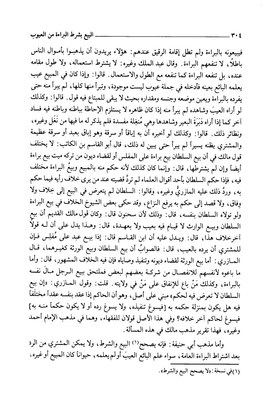 قَالُوا: وَكَذَلِكَ لَوْ أَخْبَرَهُ أَنَّ بِهِ إبَاقًا أَوْ سَرِقَةً وَهُوَ إبَاقٌ بِعَبْدٍ أَوْ سَرِقَةٌ عَظِيمَةٌ وَالْمُشْتَرِي يَظُنُّهُ يَسِيرًا لَمْ يَبْرَأْ حَتَّى يُبَيِّنَ لَهُ ذَلِكَ، قَالَ أَبُو الْقَاسِمِ بْنُ الْكَاتِبِ: لَا يَخْتَلِفُ قَوْلُ مَالِكٍ فِي أَنَّ بَيْعَ السُّلْطَانِ بَيْعُ بَرَاءَةٍ عَلَى الْمُفْلِسِ أَوْ لِقَضَاءِ دُيُونٍ مِنْ تَرِكَةِ مَيِّتٍ بَيْعُ بَرَاءَةٍ أَيْضًا وَإِنْ لَمْ يَشْتَرِطْهَا، قَالَ: وَإِنَّمَا كَانَ كَذَلِكَ؛ لِأَنَّهُ حُكْمٌ مِنْهُ بِالْمَبِيعِ وَبَيْعُ الْبَرَاءَةِ مُخْتَلَفٌ فِيهِ، فَإِذَا حَكَمَ السُّلْطَانُ بِأَحَدِ أَقْوَالِ الْعُلَمَاءِ لَمْ تُرَدَّ قَضِيَّتُهُ عِنْدَ مَنْ يَرَى خِلَافَ رَأْيِهِ فِيمَا حَكَمَ بِهِ، وَرَدَّ ذَلِكَ عَلَيْهِ الْمَازِرِيُّ وَغَيْرُهُ، وَقَالُوا: السُّلْطَانُ لَمْ يَتَعَرَّضْ فِي الْبَيْعِ إلَى خِلَافٍ وَلَا وِفَاقٍ، وَلَا قَصَدَ إلَى حُكْمٍ بِهِ يَرْفَعُ النِّزَاعَ، وَقَدْ حَكَى بَعْضُ الشُّيُوخِ الْخِلَافَ فِي بَيْعِ الْبَرَاءَةِ وَلَوْ تَوَلَّاهُ السُّلْطَانُ بِنَفْسِهِ، قَالَ: وَذَلِكَ؛ لِأَنَّ سَحْنُونًا قَالَ: وَكَانَ قَوْلُ مَالِكٍ الْقَدِيمُ أَنَّ بَيْعَ السُّلْطَانِ وَبَيْعَ الْوَارِثِ لَا قِيَامَ فِيهِ بِعَيْبٍ وَلَا بِعُهْدَةٍ، قَالَ: وَهَذَا يَدُلُّ عَلَى أَنَّ لَهُ قَوْلًا آخَرَ خِلَافَ هَذَا، قَالَ: وَيَدُلُّ عَلَيْهِ أَنَّ ابْنَ الْقَاسِمِ قَالَ: إذَا بِيعَ عَبْدٌ عَلَى مُفْلِسٍ فَإِنَّ لِلْمُشْتَرِي أَنْ يَرُدَّهُ بِالْعَيْبِ، قَالَ: فَالصَّوَابُ أَنَّ بَيْعَ السُّلْطَانِ وَبَيْعَ الْوَرَثَةِ كَغَيْرِهِمَا.