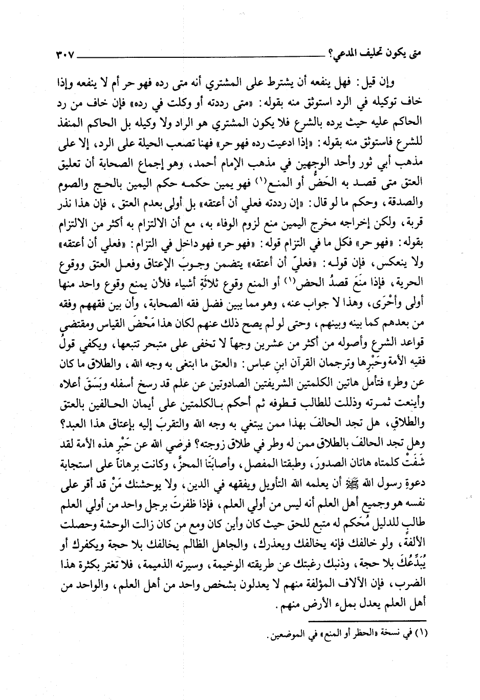 فَإِذَا مَنَعَ قَصْدُ الْحَضُّ أَوْ الْمَنْعِ وُقُوعَ ثَلَاثَةِ أَشْيَاءَ فَلَأَنْ يَمْنَعَ وُقُوعَ وَاحِدٍ مِنْهَا أَوْلَى وَأَحْرَى، وَهَذَا لَا جَوَابَ عَنْهُ، وَهُوَ مِمَّا يُبَيِّنُ فَضْلَ فِقْهِ الصَّحَابَةِ، وَأَنَّ بَيْنَ فِقْهِهِمْ وَفِقْهِ مَنْ بَعْدَهُمْ كَمَا بَيْنَهُ وَبَيْنَهُمْ، وَحَتَّى لَوْ لَمْ يَصِحَّ ذَلِكَ عَنْهُمْ لَكَانَ هَذَا مَحْضُ الْقِيَاسِ وَمُقْتَضَى قَوَاعِدِ الشَّرْعِ وَأُصُولِهِ مِنْ أَكْثَرَ مِنْ عِشْرِينَ وَجْهًا لَا تَخْفَى عَلَى مُتَبَحِّرٍ تَتَبُّعُهَا، وَيَكْفِي قَوْلُ فَقِيهِ الْأُمَّةِ وَحَبْرِهَا وَتُرْجُمَانِ الْقُرْآنِ ابْنِ عَبَّاسٍ: " الْعِتْقُ مَا اُبْتُغِيَ بِهِ وَجْهُ اللَّهِ، وَالطَّلَاقُ مَا كَانَ عَنْ وَطَرٍ " فَتَأَمَّلْ هَاتَيْنِ الْكَلِمَتَيْنِ الشَّرِيفَتَيْنِ الصَّادِرَتَيْنِ عَنْ عِلْمٍ قَدْ رَسَخَ أَسْفَلُهُ وَبَسَقَ أَعْلَاهُ وَأَيْنَعَتْ ثَمَرَتُهُ وَذُلِّلَتْ لِلطَّالِبِ قُطُوفُهُ ثُمَّ اُحْكُمْ بِالْكَلِمَتَيْنِ عَلَى أَيْمَانِ الْحَالِفِينَ بِالْعِتْقِ وَالطَّلَاقِ، هَلْ تَجِدُ الْحَالِفَ بِهَذَا مِمَّنْ يَبْتَغِي بِهِ وَجْهَ اللَّهِ وَالتَّقَرُّبَ إلَيْهِ بِإِعْتَاقِ هَذَا الْعَبْدِ؟ وَهَلْ تَجِدُ الْحَالِفَ بِالطَّلَاقِ مِمَّنْ لَهُ وَطَرٌ فِي طَلَاقِ زَوْجَتِهِ؟ فَرَضِيَ اللَّهُ عَنْ حَبْرِ هَذِهِ الْأُمَّةِ لَقَدْ شَفَتْ كَلِمَتَاهُ هَاتَانِ الصُّدُورَ، وَطَبَّقَتَا الْمُفَصَّلَ، وَأَصَابَتَا الْمَحَزَّ، وَكَانَتْ بُرْهَانًا عَلَى اسْتِجَابَةِ دَعْوَةِ رَسُولِ اللَّهِ - صَلَّى اللَّهُ عَلَيْهِ وَسَلَّمَ - أَنْ يُعَلِّمَهُ اللَّهُ التَّأْوِيلَ وَيُفَقِّهَهُ فِي الدِّينِ.