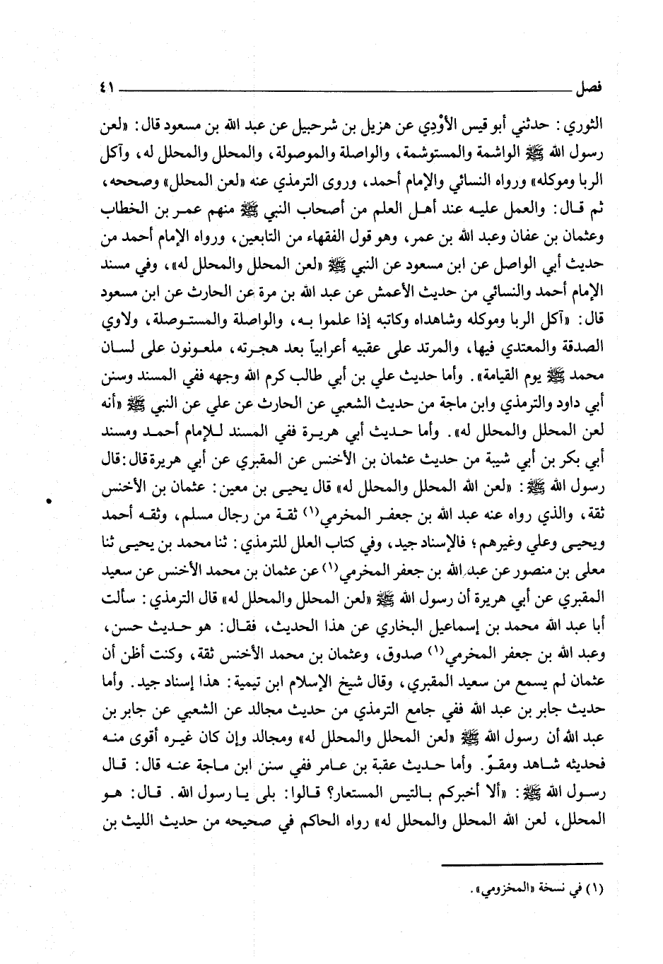 الثَّوْرِيُّ: حَدَّثَنِي أَبُو قَيْسٍ الْأَوْدِيُّ عَنْ هُزَيْلِ بْنِ شُرَحْبِيلَ عَنْ عَبْدِ اللَّهِ بْنِ مَسْعُودٍ قَالَ: «لَعَنَ رَسُولُ اللَّهِ - صَلَّى اللَّهُ عَلَيْهِ وَسَلَّمَ - الْوَاشِمَةَ وَالْمُسْتَوْشِمَة، وَالْوَاصِلَةَ وَالْمَوْصُولَةَ، وَالْمُحَلِّلَ وَالْمُحَلَّلَ لَهُ، وَآكِلَ الرِّبَا وَمُوكِلَهُ» وَرَوَاهُ النَّسَائِيّ وَالْإِمَامُ أَحْمَدُ، وَرَوَى التِّرْمِذِيُّ عَنْهُ «لَعَنَ الْمُحَلِّلَ» وَصَحَّحَهُ، ثُمَّ قَالَ: وَالْعَمَلُ عَلَيْهِ عِنْدَ أَهْلِ الْعِلْمِ مِنْ أَصْحَابِ النَّبِيِّ - صَلَّى اللَّهُ عَلَيْهِ وَسَلَّمَ - مِنْهُمْ عُمَرُ بْنُ الْخَطَّابِ وَعُثْمَانُ بْنُ عَفَّانَ وَعَبْدُ اللَّهِ بْنُ عُمَرَ، وَهُوَ قَوْلُ الْفُقَهَاءِ مِنْ التَّابِعِينَ، وَرَوَاهُ الْإِمَامُ أَحْمَدُ مِنْ حَدِيثِ أَبِي الْوَاصِلِ عَنْ ابْنِ مَسْعُودٍ عَنْ النَّبِيِّ - صَلَّى اللَّهُ عَلَيْهِ وَسَلَّمَ - «لَعَنَ الْمُحَلِّلَ وَالْمُحَلَّلَ لَهُ» ، وَفِي مُسْنَدِ الْإِمَامَ أَحْمَدَ وَالنَّسَائِيُّ مِنْ حَدِيث الْأَعْمَشِ عَنْ عَبْدِ اللَّهِ بْنِ مُرَّةَ عَنْ الْحَارِثِ عَنْ ابْنِ مَسْعُودٍ قَالَ: «آكِلُ الرِّبَا وَمُوكِلُهُ وَشَاهِدَاهُ وَكَاتِبُهُ إذَا عَلِمُوا بِهِ، وَالْوَاصِلَةُ وَالْمُسْتَوْشِمَةُ، وَلَاوِي الصَّدَقَةِ وَالْمُعْتَدِي فِيهَا، وَالْمُرْتَدُّ عَلَى عَقِبَيْهِ أَعْرَابِيًّا بَعْدَ هِجْرَتِهِ، مَلْعُونُونَ عَلَى لِسَانِ مُحَمَّدٍ - صَلَّى اللَّهُ عَلَيْهِ وَسَلَّمَ - يَوْمَ الْقِيَامَةِ» . وَأَمَّا حَدِيثُ عَلِيِّ بْنِ أَبِي طَالِبٍ كَرَّمَ اللَّهُ وَجْهَهُ فَفِي الْمُسْنَدِ وَسُنَنِ أَبِي دَاوُد وَالتِّرْمِذِيِّ وَابْنِ مَاجَهْ مِنْ حَدِيثِ الشَّعْبِيِّ عَنْ الْحَارِثِ عَنْ عَلِيٍّ عَنْ النَّبِيِّ - صَلَّى اللَّهُ عَلَيْهِ وَسَلَّمَ - «أَنَّهُ لَعَنَ الْمُحَلِّلَ وَالْمُحَلَّلَ لَهُ» .
