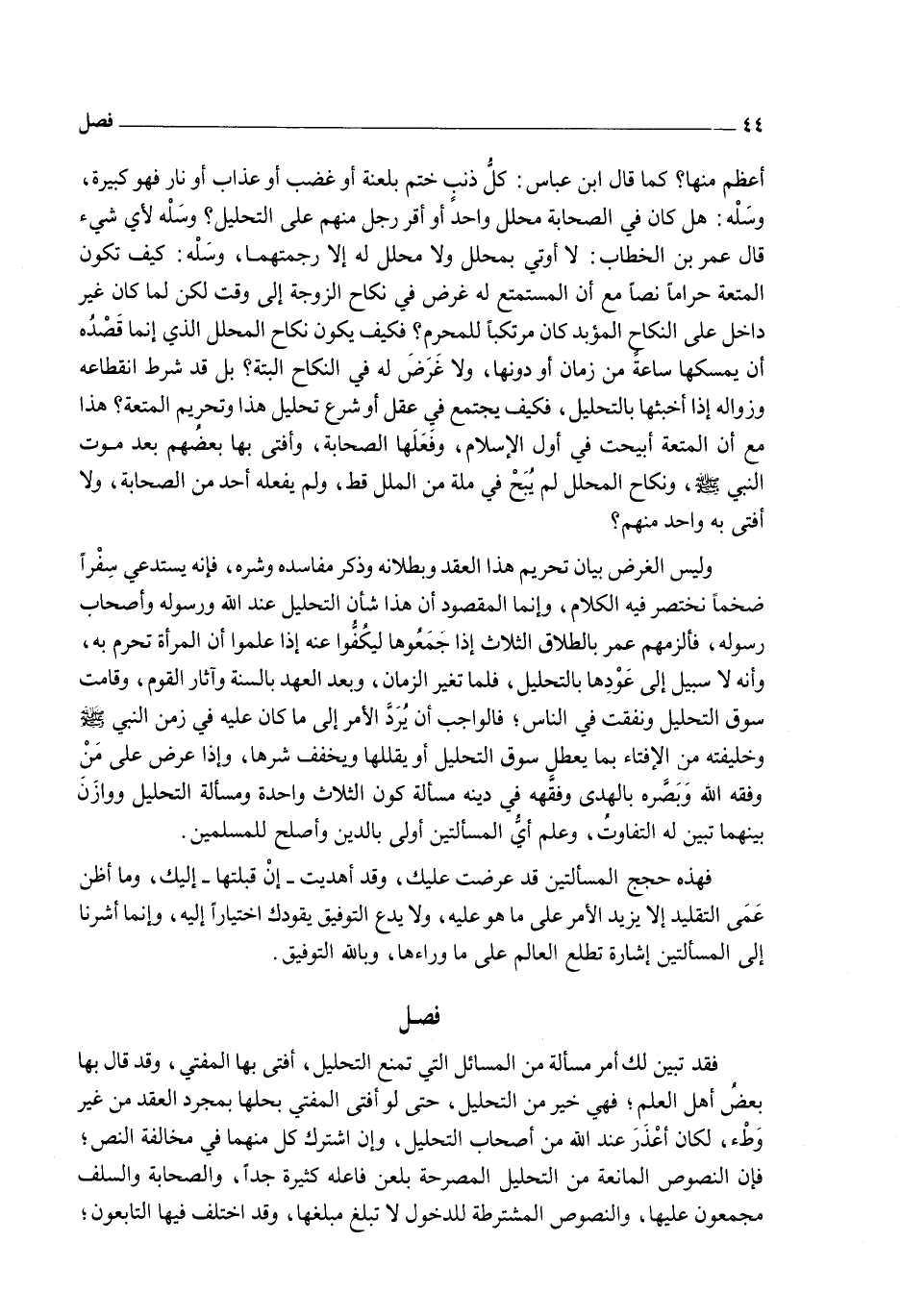 وَسَلْهُ: كَيْفَ تَكُونُ الْمُتْعَةُ حَرَامًا نَصًّا مَعَ أَنَّ الْمُسْتَمْتِعَ لَهُ غَرَضٌ فِي نِكَاحِ الزَّوْجَةِ إلَى وَقْتٍ لَكِنْ لَمَّا كَانَ غَيْرَ دَاخِلٍ عَلَى النِّكَاحِ الْمُؤَبَّدِ كَانَ مُرْتَكِبًا لِلْمُحَرَّمِ؟ فَكَيْفَ يَكُونُ نِكَاحُ الْمُحَلِّلِ الَّذِي إنَّمَا قَصْدُهُ أَنْ يُمْسِكَهَا سَاعَةً مِنْ زَمَانٍ أَوْ دُونَهَا، وَلَا غَرَضَ لَهُ فِي النِّكَاحِ أَلْبَتَّةَ؟ بَلْ قَدْ شَرَطَ انْقِطَاعَهُ وَزَوَالَهُ إذَا أَخْبَثَهَا بِالتَّحْلِيلِ، فَكَيْفَ يَجْتَمِعُ فِي عَقْلٍ أَوْ شَرْعٍ تَحْلِيلُ هَذَا وَتَحْرِيمُ الْمُتْعَةِ؟ هَذَا مَعَ أَنَّ الْمُتْعَةَ أُبِيحَتْ فِي أَوَّلِ الْإِسْلَامِ، وَفَعَلَهَا الصَّحَابَةُ، وَأَفْتَى بِهَا بَعْضُهُمْ بَعْدَ مَوْتِ النَّبِيِّ - صَلَّى اللَّهُ عَلَيْهِ وَسَلَّمَ -، وَنِكَاحُ الْمُحَلِّلِ لَمْ يُبَحْ فِي مِلَّةٍ مِنْ الْمِلَلِ قَطُّ وَلَمْ يَفْعَلْهُ أَحَدٌ مِنْ الصَّحَابَةِ، وَلَا أَفْتَى بِهِ وَاحِدٌ مِنْهُمْ؟ وَلَيْسَ الْغَرَضُ بَيَانَ تَحْرِيمِ هَذَا الْعَقْدِ وَبُطْلَانِهِ وَذِكْرِ مَفَاسِدِهِ وَشَرِّهِ، فَإِنَّهُ يَسْتَدْعِي سِفْرًا ضَخْمًا نَخْتَصِرُ فِيهِ الْكَلَامَ، وَإِنَّمَا الْمَقْصُودُ أَنَّ هَذَا شَأْنُ التَّحْلِيلِ عِنْدَ اللَّهِ وَرَسُولِهِ وَأَصْحَابِ رَسُولِهِ، فَأَلْزَمَهُمْ عُمَرُ بِالطَّلَاقِ الثَّلَاثِ إذَا جَمَعُوهَا لِيَكُفُّوا عَنْهُ إذَا عَلِمُوا أَنَّ الْمَرْأَةَ تُحَرَّمُ بِهِ، وَأَنَّهُ لَا سَبِيلَ إلَى عَوْدِهَا بِالتَّحْلِيلِ، فَلَمَّا تَغَيَّرَ الزَّمَانُ، وَبَعُدَ الْعَهْدِ بِالسَّنَةِ وَآثَارِ الْقَوْمِ، وَقَامَتْ سُوقُ التَّحْلِيلِ وَنَفَّقَتْ فِي النَّاسِ؛ فَالْوَاجِبُ أَنْ يُرَدَّ الْأَمْرُ إلَى مَا كَانَ عَلَيْهِ فِي زَمَنِ النَّبِيِّ - صَلَّى اللَّهُ عَلَيْهِ وَسَلَّمَ - وَخَلِيفَتِهِ مِنْ الْإِفْتَاءِ بِمَا يُعَطِّلُ سُوقَ التَّحْلِيلِ أَوْ يُقَلِّلُهَا وَيُخَفِّفُ شَرَّهَا، وَإِذَا عَرَضَ عَلَى مَنْ وَفَّقَهُ اللَّهُ وَبَصَّرَهُ بِالْهُدَى وَفَقَّهَهُ فِي دِينِهِ مَسْأَلَةُ كَوْنِ الثَّلَاثِ وَاحِدَةً وَمَسْأَلَةُ التَّحْلِيلِ وَوَازَنَ بَيْنَهُمَا تَبَيَّنَ لَهُ التَّفَاوُتُ، وَعُلِمَ أَيُّ الْمَسْأَلَتَيْنِ أَوْلَى بِالدِّينِ وَأَصْلَحُ لِلْمُسْلِمِينَ.