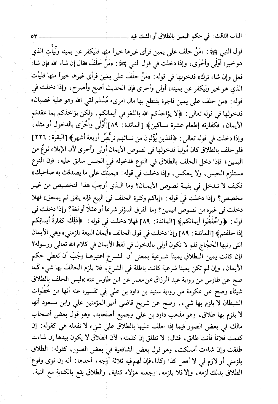 قَوْلِ النَّبِيِّ - صَلَّى اللَّهُ عَلَيْهِ وَسَلَّمَ -: «مَنْ حَلَفَ عَلَى يَمِينٍ فَرَأَى غَيْرَهَا خَيْرًا مِنْهَا فَلْيُكَفِّرْ عَنْ يَمِينِهِ وَلْيَأْتِ الَّذِي هُوَ خَيْرٌ» أَوْلَى وَأَحْرَى، وَإِذَا دَخَلَتْ فِي قَوْلِ النَّبِيِّ - صَلَّى اللَّهُ عَلَيْهِ وَسَلَّمَ -: «مَنْ حَلَفَ فَقَالَ إنْ شَاءَ اللَّهُ فَإِنْ شَاءَ فَعَلَ وَإِنْ شَاءَ تَرَكَ» فَدُخُولُهَا فِي قَوْلِهِ «مَنْ حَلَفَ عَلَى يَمِينٍ فَرَأَى غَيْرَهَا خَيْرًا مِنْهَا فَلْيَأْتِ الَّذِي هُوَ خَيْرٌ وَلْيُكَفِّرْ عَنْ يَمِينِهِ» أَوْلَى وَأَحْرَى فَإِنَّ الْحَدِيثَ أَصَحُّ وَأَصْرَحُ، وَإِذَا دَخَلَتْ فِي قَوْلِهِ: «مَنْ حَلَفَ عَلَى يَمِينٍ فَاجِرَةٍ يَقْتَطِعُ بِهَا مَالَ امْرِئٍ مُسْلِمٍ لَقِيَ اللَّهَ وَهُوَ عَلَيْهِ غَضْبَانُ» فَدُخُولُهَا فِي قَوْله تَعَالَى: {لا يُؤَاخِذُكُمُ اللَّهُ بِاللَّغْوِ فِي أَيْمَانِكُمْ وَلَكِنْ يُؤَاخِذُكُمْ بِمَا عَقَّدْتُمُ الأَيْمَانَ فَكَفَّارَتُهُ إِطْعَامُ عَشَرَةِ مَسَاكِينَ} [المائدة: 89] أَوْلَى وَأَحْرَى بِالدُّخُولِ أَوْ مِثْلِهِ، وَإِذَا دَخَلَتْ فِي قَوْله تَعَالَى: {لِلَّذِينَ يُؤْلُونَ مِنْ نِسَائِهِمْ تَرَبُّصُ أَرْبَعَةِ أَشْهُرٍ} [البقرة: 226] فَلَوْ حَلَفَ بِالطَّلَاقِ كَانَ مُولِيًا فَدُخُولُهَا فِي نُصُوصِ الْأَيْمَانِ أَوْلَى وَأَحْرَى لِأَنَّ الْإِيلَاءَ نَوْعٌ مِنْ الْيَمِينِ؛ فَإِذَا دَخَلَ الْحَلِفُ بِالطَّلَاقِ فِي النَّوْعِ فَدُخُولُهُ فِي الْجِنْسِ سَابِقٌ عَلَيْهِ، فَإِنَّ النَّوْعَ مُسْتَلْزِمٌ الْحَبْسَ، وَلَا يَنْعَكِسُ، وَإِذَا دَخَلَتْ فِي قَوْلِهِ: «يَمِينُك عَلَى مَا يُصَدِّقُك بِهِ صَاحِبُك» فَكَيْفَ لَا تَدْخُلُ فِي بَقِيَّةِ نُصُوصِ الْأَيْمَانِ؟ وَمَا الَّذِي أَوْجَبَ هَذَا التَّخْصِيصَ مِنْ غَيْرِ مُخَصِّصٍ؟ وَإِذَا دَخَلَتْ فِي قَوْلِهِ: «إيَّاكُمْ وَكَثْرَةَ الْحَلِفِ فِي الْبَيْعِ فَإِنَّهُ يُنَفِّقُ ثُمَّ يَمْحَقُ» فَهَلَّا دَخَلَتْ فِي غَيْرِهِ مِنْ نُصُوصِ الْيَمِينِ وَمَا الْفَرْقُ الْمُؤَثِّرُ شَرْعًا أَوْ عَقْلًا أَوْ لُغَةً؟