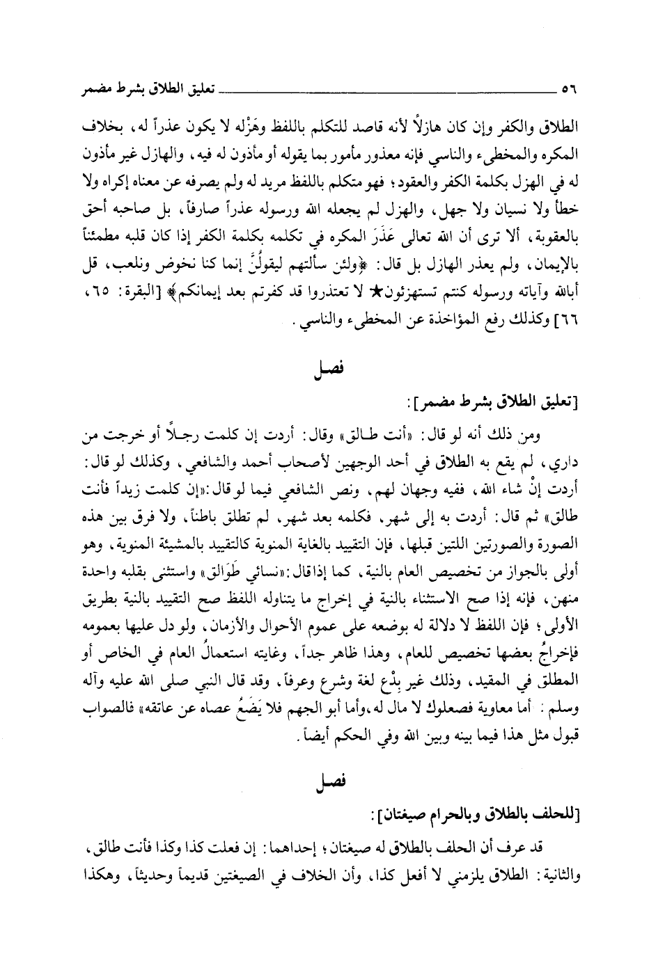 وَمِنْ ذَلِكَ أَنَّهُ لَوْ قَالَ: " أَنْتِ طَالِقٌ " وَقَالَ: أَرَدْت إنْ كَلَّمْت رَجُلًا أَوْ خَرَجْت مِنْ دَارِي، لَمْ يَقَعْ بِهِ الطَّلَاقُ فِي أَحَدِ الْوَجْهَيْنِ لِأَصْحَابِ أَحْمَدَ وَالشَّافِعِيِّ، وَكَذَلِكَ لَوْ قَالَ: أَرَدْت إنْ شَاءَ اللَّهُ، فَفِيهِ وَجْهَانِ لَهُمْ، وَنَصَّ الشَّافِعِيُّ فِيمَا لَوْ قَالَ: " إنْ كَلَّمْت زَيْدًا فَأَنْتِ طَالِقٌ " ثُمَّ قَالَ: أَرَدْت بِهِ إلَى شَهْرٍ، فَكَلَّمَهُ بَعْدَ شَهْرٍ، لَمْ تَطْلُقْ بَاطِنًا، وَلَا فَرْقَ بَيْنَ هَذِهِ الصُّورَةِ وَالصُّورَتَيْنِ اللَّتَيْنِ قَبْلَهَا، فَإِنَّ التَّقْيِيدَ بِالْغَايَةِ الْمَنْوِيَّةِ كَالتَّقْيِيدِ بِالْمَشِيئَةِ الْمَنْوِيَّةِ، وَهُوَ أَوْلَى بِالْجَوَازِ مِنْ تَخْصِيصِ الْعَامِّ بِالنِّيَّةِ، كَمَا إذَا قَالَ: " نِسَائِي طَوَالِقُ " وَاسْتَثْنَى بِقَلْبِهِ وَاحِدَةً مِنْهُنَّ، فَإِنَّهُ إذَا صَحَّ الِاسْتِثْنَاءُ بِالنِّيَّةِ فِي إخْرَاجِ مَا يَتَنَاوَلُهُ اللَّفْظُ صَحَّ التَّقْيِيدُ بِالنِّيَّةِ بِطَرِيقِ الْأَوْلَى؛ فَإِنَّ اللَّفْظَ لَا دَلَالَةَ لَهُ بِوَضْعِهِ عَلَى عُمُومِ الْأَحْوَالِ وَالْأَزْمَانِ، وَلَوْ دَلَّ عَلَيْهَا بِعُمُومِهِ فَإِخْرَاجُ بَعْضِهَا تَخْصِيصٌ لِلْعَامِّ، وَهَذَا ظَاهِرٌ جِدًّا، وَغَايَتُهُ اسْتِعْمَالُ الْعَامِّ فِي الْخَاصِّ أَوْ الْمُطْلَقِ فِي الْمُقَيَّدِ، وَذَلِكَ غَيْرُ بِدْعٍ لُغَةً وَشَرْعًا وَعُرْفًا، وَقَدْ قَالَ النَّبِيُّ - صَلَّى اللَّهُ عَلَيْهِ وَآلِهِ وَسَلَّمَ -: «أَمَّا مُعَاوِيَةُ فَصُعْلُوكٌ لَا مَالَ لَهُ، وَأَمَّا أَبُو الْجَهْمِ فَلَا يَضَعُ عَصَاهُ عَنْ عَاتِقِهِ» فَالصَّوَابُ قَبُولُ مِثْلِ هَذَا فِيمَا بَيْنَهُ وَبَيْنَ اللَّهِ وَفِي الْحُكْمِ أَيْضًا.