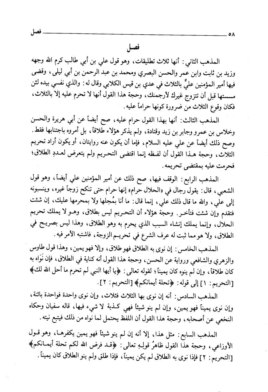 الْمَذْهَبُ الرَّابِعُ: الْوَقْفُ فِيهَا، صَحَّ ذَلِكَ عَنْ أَمِيرِ الْمُؤْمِنِينَ عَلِيٍّ أَيْضًا، وَهُوَ قَوْلُ الشَّعْبِيِّ، قَالَ: يَقُولُ رِجَالٌ فِي " الْحَلَالُ حَرَامٌ " إنَّهَا حَرَامٌ حَتَّى تَنْكِحَ زَوْجًا غَيْرَهُ، وَيَنْسُبُونَهُ إلَى عَلِيٍّ، وَاَللَّهِ مَا قَالَ ذَلِكَ عَلِيٌّ، إنَّمَا قَالَ: مَا أَنَا بِمُحِلِّهَا وَلَا بِمُحَرِّمِهَا عَلَيْك، إنْ شِئْت فَتَقَدَّمْ وَإِنْ شِئْت فَتَأَخَّرْ. وَحُجَّةُ هَؤُلَاءِ أَنَّ التَّحْرِيمَ لَيْسَ بِطَلَاقٍ، وَهُوَ لَا يَمْلِكُ تَحْرِيمَ الْحَلَالِ، وَإِنَّمَا يَمْلِكُ إنْشَاءَ السَّبَبِ الَّذِي يُحَرِّمُ بِهِ وَهُوَ الطَّلَاقُ، وَهَذَا لَيْسَ بِصَرِيحٍ فِي الطَّلَاقِ، وَلَا هُوَ مِمَّا ثَبَتَ لَهُ عُرْفُ الشَّرْعِ فِي تَحْرِيمِ الزَّوْجَةِ، فَاشْتَبَهَ الْأَمْرُ فِيهِ.