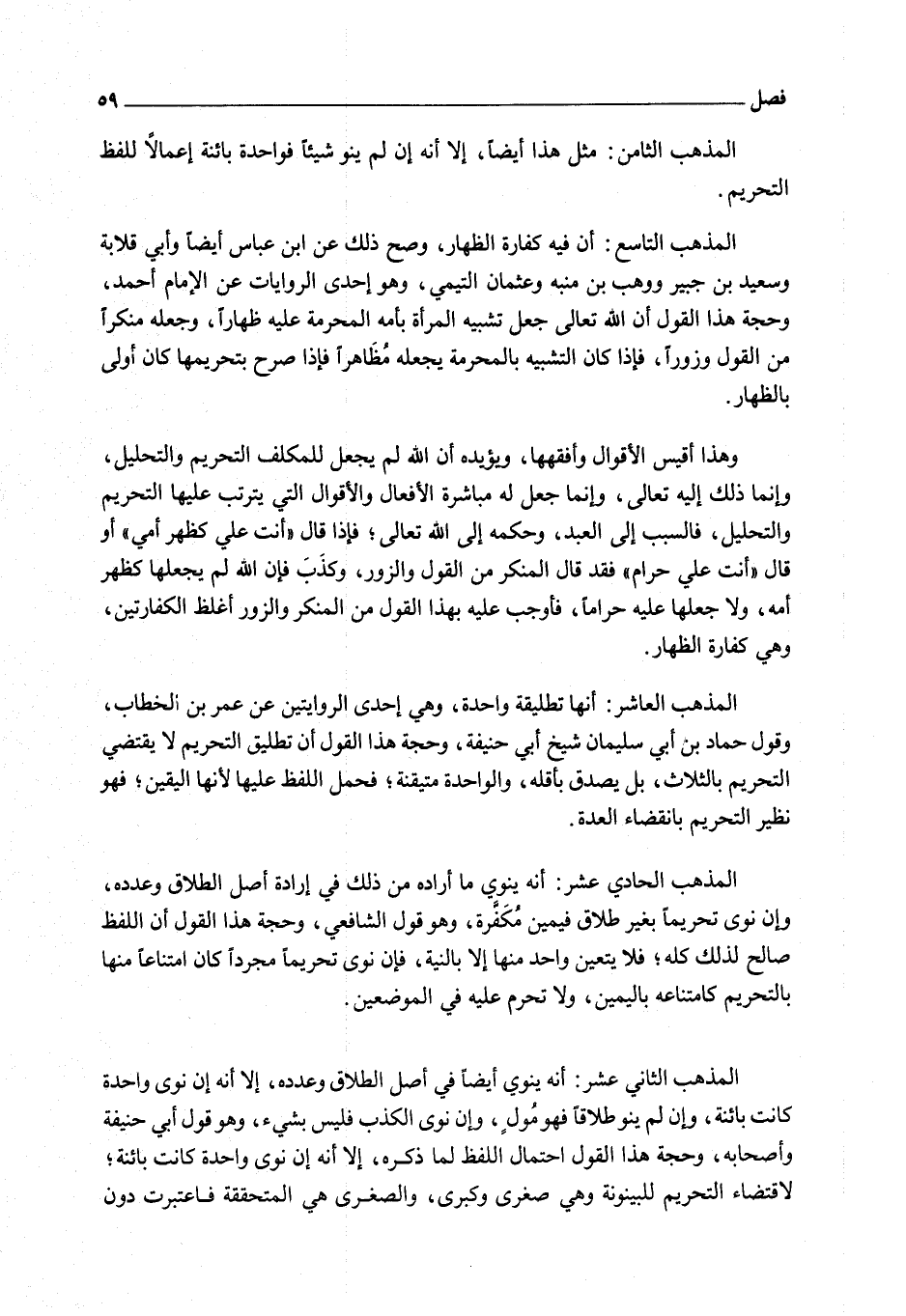 الْمَذْهَبُ التَّاسِعُ: أَنَّ فِيهِ كَفَّارَةَ الظِّهَارِ، وَصَحَّ ذَلِكَ عَنْ ابْنِ عَبَّاسٍ أَيْضًا وَأَبِي قِلَابَةَ وَسَعِيدِ بْنِ جُبَيْرٍ وَوَهْبِ بْنِ مُنَبِّهٍ وَعُثْمَانَ التَّيْمِيِّ، وَهُوَ إحْدَى الرِّوَايَاتِ عَنْ الْإِمَامِ أَحْمَدَ، وَحُجَّةُ هَذَا الْقَوْلِ أَنَّ اللَّهَ تَعَالَى جَعَلَ تَشْبِيهَ الْمَرْأَةِ بِأُمِّهِ الْمُحَرَّمَةِ عَلَيْهِ ظِهَارًا، وَجَعَلَهُ مُنْكَرًا مِنْ الْقَوْلِ وَزُورًا، فَإِذَا كَانَ التَّشْبِيهُ بِالْمُحَرَّمَةِ يَجْعَلُهُ مُظَاهِرًا فَإِذَا صَرَّحَ بِتَحْرِيمِهَا كَانَ أَوْلَى بِالظِّهَارِ.