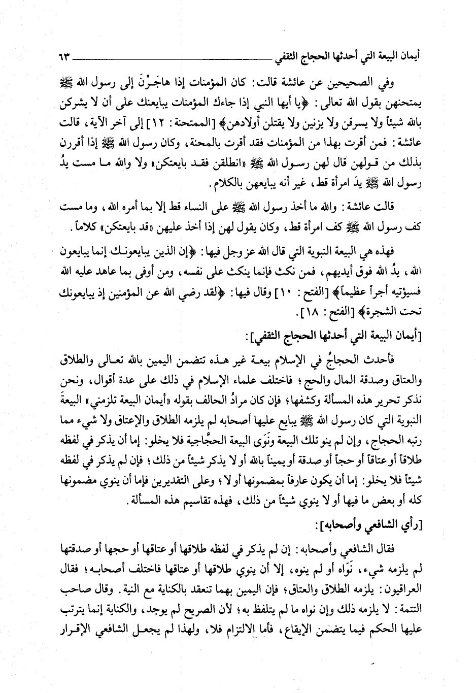 فَأَحْدَثَ الْحَجَّاجُ فِي الْإِسْلَامِ بَيْعَةً غَيْرَ هَذِهِ تَتَضَمَّنُ الْيَمِينَ بِاَللَّهِ تَعَالَى وَالطَّلَاقَ وَالْعَتَاقَ وَصَدَقَةَ الْمَالِ وَالْحَجَّ؛ فَاخْتَلَفَ عُلَمَاءُ الْإِسْلَامِ فِي ذَلِكَ عَلَى عِدَّةِ أَقْوَالٍ، وَنَحْنُ نَذْكُرُ تَحْرِيرَ هَذِهِ الْمَسْأَلَةِ وَكَشْفَهَا؛ فَإِنْ كَانَ مُرَادُ الْحَالِفِ بِقَوْلِهِ " أَيْمَانُ الْبَيْعَةِ تَلْزَمُنِي " الْبَيْعَةَ النَّبَوِيَّةَ الَّتِي كَانَ رَسُولُ اللَّهِ - صَلَّى اللَّهُ عَلَيْهِ وَسَلَّمَ - يُبَايِعُ عَلَيْهَا أَصْحَابَهُ لَمْ يَلْزَمْهُ الطَّلَاقُ وَالْإِعْتَاقُ وَلَا شَيْءٌ مِمَّا رَتَّبَهُ الْحَجَّاجُ، وَإِنْ لَمْ يَنْوِ تِلْكَ الْبَيْعَةَ وَنَوَى الْبَيْعَةَ الْحَجَّاجِيَّةَ فَلَا يَخْلُو: إمَّا أَنْ يَذْكُرَ فِي لَفْظِهِ طَلَاقًا أَوْ عَتَاقًا أَوْ حَجًّا أَوْ صَدَقَةً أَوْ يَمِينًا بِاَللَّهِ أَوْ لَا يَذْكُرَ شَيْئًا مِنْ ذَلِكَ؛ فَإِنْ لَمْ يَذْكُرْ فِي لَفْظِهِ شَيْئًا فَلَا يَخْلُو: إمَّا أَنْ يَكُونَ عَارِفًا بِمَضْمُونِهَا أَوْ لَا؛ وَعَلَى التَّقْدِيرَيْنِ فَإِمَّا أَنْ يَنْوِيَ مَضْمُونَهَا كُلَّهُ أَوْ بَعْضَ مَا فِيهَا أَوْ لَا يَنْوِيَ شَيْئًا مِنْ ذَلِكَ، فَهَذِهِ تَقَاسِيمُ هَذِهِ الْمَسْأَلَةِ.