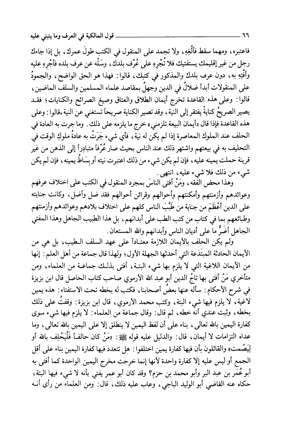 فَاعْتَبِرْهُ، وَمَهْمَا سَقَطَ فَأَلْغِهِ، وَلَا تَجْمُدْ عَلَى الْمَنْقُولِ فِي الْكُتُبِ طُولَ عُمْرِك، بَلْ إذَا جَاءَك رَجُلٌ مِنْ غَيْرِ إقْلِيمِك يَسْتَفْتِيك فَلَا تُجْرِهِ عَلَى عُرْفِ بَلَدِك، وَسَلْهُ عَنْ عُرْفِ بَلَدِهِ فَأَجْرِهِ عَلَيْهِ وَأَفْتِهِ بِهِ، دُونَ عُرْفِ بَلَدِك وَالْمَذْكُورِ فِي كُتُبِك، قَالُوا: فَهَذَا هُوَ الْحَقُّ الْوَاضِحُ، وَالْجُمُودُ عَلَى الْمَنْقُولَاتِ أَبَدًا ضَلَالٌ فِي الدِّينِ وَجَهْلٌ بِمَقَاصِدِ عُلَمَاءِ الْمُسْلِمِينَ وَالسَّلَفِ الْمَاضِينَ، قَالُوا: وَعَلَى هَذِهِ الْقَاعِدَةِ تَخْرُجُ أَيْمَانُ الطَّلَاقِ وَالْعَتَاقِ وَصِيَغُ الصَّرَائِحِ وَالْكِنَايَاتِ؛ فَقَدْ يَصِيرُ الصَّرِيحُ كِنَايَةً يَفْتَقِرُ إلَى النِّيَّةِ، وَقَدْ تَصِيرُ الْكِنَايَةُ صَرِيحًا تَسْتَغْنِي عَنْ النِّيَّةِ، قَالُوا: وَعَلَى هَذِهِ الْقَاعِدَةِ فَإِذَا قَالَ " أَيْمَانُ الْبَيْعَةِ تَلْزَمُنِي " خَرَجَ مَا يَلْزَمُهُ عَلَى ذَلِكَ. وَمَا جَرَتْ بِهِ الْعَادَةُ فِي الْحَلِفِ عِنْدَ الْمُلُوكِ الْمُعَاصِرَةِ إذَا لَمْ يَكُنْ لَهُ نِيَّةٌ، فَأَيُّ شَيْءٍ جَرَتْ بِهِ عَادَةُ مُلُوكِ الْوَقْتِ فِي التَّحْلِيفِ بِهِ فِي بَيْعَتِهِمْ وَاشْتُهِرَ ذَلِكَ عِنْدَ النَّاسِ بِحَيْثُ صَارَ عُرْفًا مُتَبَادِرًا إلَى الذِّهْنِ مِنْ غَيْرِ قَرِينَةٍ حُمِلَتْ يَمِينُهُ عَلَيْهِ، فَإِنْ لَمْ يَكُنْ شَيْءٌ مِنْ ذَلِكَ اُعْتُبِرَتْ نِيَّتُهُ أَوْ بِسَاطُ يَمِينِهِ، فَإِنْ لَمْ يَكُنْ شَيْءٌ مِنْ ذَلِكَ فَلَا شَيْءَ عَلَيْهِ، انْتَهَى.