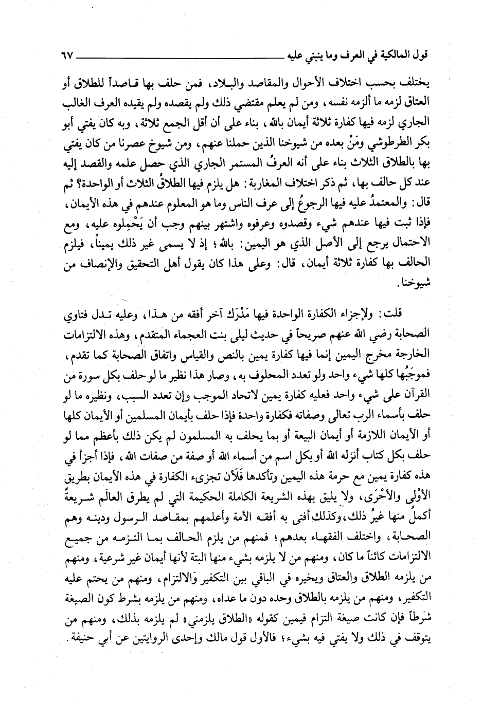 يَخْتَلِفُ بِحَسَبِ اخْتِلَافِ الْأَحْوَالِ وَالْمَقَاصِدِ وَالْبِلَادِ، فَمَنْ حَلَفَ بِهَا قَاصِدًا لِلطَّلَاقِ أَوْ الْعَتَاقِ لَزِمَهُ مَا أَلْزَمَهُ نَفْسَهُ، وَمَنْ لَمْ يَعْلَمْ مُقْتَضَى ذَلِكَ وَلَمْ يَقْصِدْهُ وَلَمْ يُقَيِّدْهُ الْعُرْفُ الْغَالِبُ الْجَارِي لَزِمَهُ فِيهَا كَفَّارَةُ ثَلَاثَةِ أَيْمَانٍ بِاَللَّهِ، بِنَاءً عَلَى أَنَّ أَقَلَّ الْجَمْعِ ثَلَاثَةٌ، وَبِهِ كَانَ يُفْتِي أَبُو بَكْرٍ الطُّرْطُوشِيُّ وَمَنْ بَعْدَهُ مِنْ شُيُوخِنَا الَّذِينَ حَمَلْنَا عَنْهُمْ، وَمِنْ شُيُوخِ عَصْرِنَا مَنْ كَانَ يُفْتِي بِهَا بِالطَّلَاقِ الثَّلَاثِ بِنَاءً عَلَى أَنَّهُ الْعُرْفُ الْمُسْتَمِرُّ الْجَارِي الَّذِي يَحْصُلُ عِلْمُهُ وَالْقَصْدُ إلَيْهِ عِنْدَ كُلِّ حَالِفٍ بِهَا، ثُمَّ ذُكِرَ اخْتِلَافُ الْمَغَارِبَةِ: هَلْ يَلْزَمُ فِيهَا الطَّلَاقُ الثَّلَاثُ أَوْ الْوَاحِدَةُ؟ ثُمَّ قَالَ: وَالْمُعْتَمَدُ عَلَيْهِ فِيهَا الرُّجُوعُ إلَى عُرْفِ النَّاسِ وَمَا هُوَ الْمَعْلُومُ عِنْدَهُمْ فِي هَذِهِ الْأَيْمَانِ، فَإِذَا ثَبَتَ فِيهَا عِنْدَهُمْ شَيْءٌ وَقَصَدُوهُ وَعَرَفُوهُ وَاشْتُهِرَ بَيْنَهُمْ وَجَبَ أَنْ يَحْمِلُوهُ عَلَيْهِ، وَمَعَ الِاحْتِمَالِ يُرْجَعُ إلَى الْأَصْلِ الَّذِي هُوَ الْيَمِينُ: بِاَللَّهِ؛ إذْ لَا يُسَمَّى غَيْرُ ذَلِكَ يَمِينًا، فَيَلْزَمُ الْحَالِفَ بِهَا كَفَّارَةُ ثَلَاثَةِ أَيْمَانٍ، قَالَ: وَعَلَى هَذَا كَانَ يَقُولُ أَهْلُ التَّحْقِيقِ وَالْإِنْصَافِ مِنْ شُيُوخِنَا.