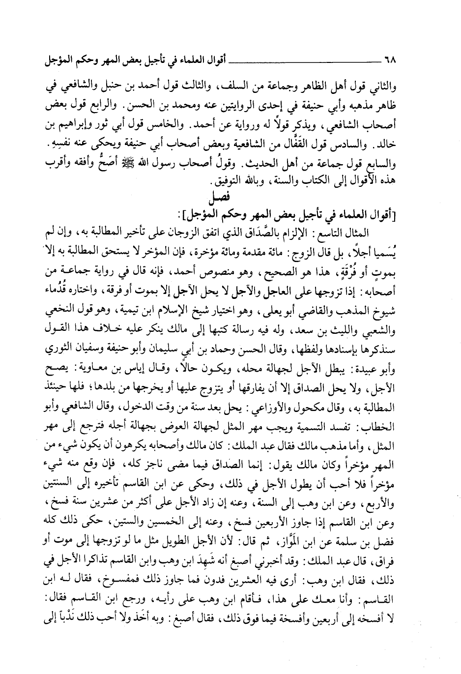 الْمِثَالُ التَّاسِعُ: الْإِلْزَامُ بِالصَّدَاقِ الَّذِي اتَّفَقَ الزَّوْجَانِ عَلَى تَأْخِيرِ الْمُطَالَبَةِ بِهِ، وَإِنْ لَمْ يُسَمِّيَا أَجَلًا، بَلْ قَالَ الزَّوْجُ: مِائَةٌ مُقَدَّمَةٌ وَمِائَةٌ مُؤَخَّرَةٌ، فَإِنَّ الْمُؤَخَّرَ لَا يَسْتَحِقُّ الْمُطَالَبَةَ بِهِ إلَّا بِمَوْتٍ أَوْ فُرْقَةٍ، هَذَا هُوَ الصَّحِيحُ، وَهُوَ مَنْصُوصُ أَحْمَدَ، فَإِنَّهُ قَالَ فِي رِوَايَةِ جَمَاعَةٍ مِنْ أَصْحَابِهِ: إذَا تَزَوَّجَهَا عَلَى الْعَاجِلِ وَالْآجِلِ لَا يَحِلُّ الْآجِلُ إلَّا بِمَوْتٍ أَوْ فُرْقَةٍ، وَاخْتَارَهُ قُدَمَاءُ شُيُوخِ الْمَذْهَبِ وَالْقَاضِي أَبُو يَعْلَى، وَهُوَ اخْتِيَارُ شَيْخِ الْإِسْلَامِ ابْنُ تَيْمِيَّةَ، وَهُوَ قَوْلُ النَّخَعِيِّ وَالشَّعْبِيِّ وَاللَّيْثِ بْنِ سَعْدٍ، وَلَهُ فِيهِ رِسَالَةٌ كَتَبَهَا إلَى مَالِكٍ يُنْكِرُ عَلَيْهِ خِلَافَ هَذَا الْقَوْلِ سَنَذْكُرُهَا بِإِسْنَادِهَا وَلَفْظِهَا، وَقَالَ الْحَسَنُ وَحَمَّادُ بْنُ أَبِي سُلَيْمَانَ وَأَبُو حَنِيفَةَ وَسُفْيَانُ الثَّوْرِيُّ وَأَبُو عُبَيْدَةَ: يَبْطُلُ الْآجِلُ لِجَهَالَةِ مَحِلِّهِ، وَيَكُونُ حَالًّا، وَقَالَ إيَاسُ بْنُ مُعَاوِيَةَ: يَصِحُّ الْآجِلُ، وَلَا يَحِلُّ الصَّدَاقُ إلَّا أَنْ يُفَارِقَهَا أَوْ يَتَزَوَّجَ عَلَيْهَا أَوْ يُخْرِجَهَا مِنْ بَلَدِهَا؛ فَلَهَا حِينَئِذٍ الْمُطَالَبَةُ بِهِ، وَقَالَ مَكْحُولٌ وَالْأَوْزَاعِيُّ: يَحِلُّ بَعْدَ سَنَةٍ مِنْ وَقْتِ الدُّخُولِ، وَقَالَ الشَّافِعِيُّ وَأَبُو الْخَطَّابِ: تَفْسُدُ التَّسْمِيَةُ وَيَجِبُ مَهْرُ الْمِثْلِ لِجَهَالَةِ الْعِوَضِ بِجَهَالَةِ أَجَلِهِ فَتَرْجِعُ إلَى مَهْرِ الْمِثْلِ، وَأَمَّا مَذْهَبُ مَالِكٍ فَقَالَ عَبْدُ الْمَلِكِ: كَانَ مَالِكٌ وَأَصْحَابُهُ يَكْرَهُونَ أَنْ يَكُونَ شَيْءٌ مِنْ الْمَهْرِ مُؤَخَّرًا وَكَانَ مَالِكٌ يَقُولُ: إنَّمَا الصَّدَاقُ فِيمَا مَضَى نَاجِزٌ كُلُّهُ، فَإِنْ وَقَعَ مِنْهُ شَيْءٌ مُؤَخَّرًا فَلَا أُحِبُّ أَنْ يَطُولَ الْأَجَلُ فِي ذَلِكَ، وَحَكَى عَنْ ابْنِ الْقَاسِمِ تَأْخِيرَهُ إلَى السَّنَتَيْنِ وَالْأَرْبَعِ، وَعَنْ ابْنِ وَهْبٍ إلَى السَّنَةِ، وَعَنْهُ إنْ زَادَ الْأَجَلُ عَلَى أَكْثَرَ مِنْ عِشْرِينَ سَنَةً فُسِخَ، وَعَنْ ابْنِ الْقَاسِمِ إذَا جَاوَزَ الْأَرْبَعِينَ فُسِخَ، وَعَنْهُ إلَى الْخَمْسِينَ وَالسِّتِّينَ، حَكَى ذَلِكَ كُلَّهُ فَضْلُ بْنُ سَلَمَةَ عَنْ ابْنِ الْمَوَّازِ، ثُمَّ قَالَ: لِأَنَّ الْأَجَلَ الطَّوِيلَ مِثْلُ مَا لَوْ تَزَوَّجَهَا إلَى مَوْتٍ أَوْ فِرَاقٍ.