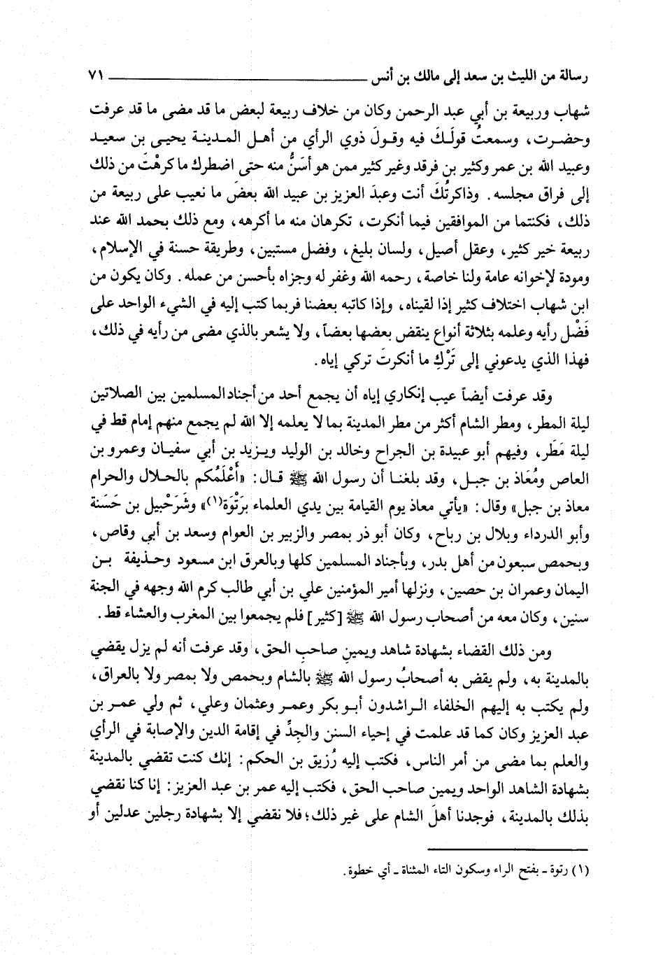 وَقَدْ عَرَفْت أَيْضًا عَيْبَ إنْكَارِي إيَّاهُ أَنْ يَجْمَعَ أَحَدٌ مِنْ أَجْنَادِ الْمُسْلِمِينَ بَيْنَ الصَّلَاتَيْنِ لَيْلَةَ الْمَطَرِ، وَمَطَرُ الشَّامِ أَكْثَرُ مِنْ مَطَرِ الْمَدِينَةِ بِمَا لَا يَعْلَمُهُ إلَّا اللَّهُ لَمْ يَجْمَعْ مِنْهُمْ إمَامٌ قَطُّ فِي لَيْلَةِ مَطَرٍ، وَفِيهِمْ أَبُو عُبَيْدَةَ بْنُ الْجَرَّاحِ وَخَالِدُ بْنُ الْوَلِيدِ وَيَزِيدُ بْنُ أَبِي سُفْيَانَ وَعَمْرُو بْنُ الْعَاصِ وَمُعَاذُ بْنُ جَبَلٍ، وَقَدْ بَلَغَنَا أَنَّ رَسُولَ اللَّهِ - صَلَّى اللَّهُ عَلَيْهِ وَسَلَّمَ - قَالَ: «أَعْلَمُكُمْ بِالْحَلَالِ وَالْحَرَامِ مُعَاذُ بْنُ جَبَلٍ» وَقَالَ: «يَأْتِي مُعَاذٌ يَوْمَ الْقِيَامَةِ بَيْنَ يَدَيْ الْعُلَمَاءِ بِرَتْوَةٍ» وَشُرَحْبِيلُ بْنُ حَسَنَةَ وَأَبُو الدَّرْدَاءِ وَبِلَالُ بْنُ رَبَاحٍ، وَكَانَ أَبُو ذَرٍّ بِمِصْرَ وَالزُّبَيْرُ بْنُ الْعَوَّامِ وَسَعْدُ بْنُ أَبِي وَقَّاصٍ، وَبِحِمْصَ سَبْعُونَ مِنْ أَهْلِ بَدْرٍ، وَبِأَجْنَادِ الْمُسْلِمِينَ كُلِّهَا وَبِالْعِرَاقِ ابْنُ مَسْعُودٍ وَحُذَيْفَةُ بْنُ الْيَمَانِ وَعِمْرَانُ بْنُ حُصَيْنٍ، وَنَزَلَهَا أَمِيرُ الْمُؤْمِنِينَ عَلِيُّ بْنُ أَبِي طَالِبٍ كَرَّمَ اللَّهُ وَجْهَهُ فِي الْجَنَّةِ سِنِينَ، وَكَانَ مَعَهُ مِنْ أَصْحَابِ رَسُولِ اللَّهِ - صَلَّى اللَّهُ عَلَيْهِ وَسَلَّمَ -[كَثِيرٌ] فَلَمْ يَجْمَعُوا بَيْنَ الْمَغْرِبِ وَالْعِشَاءِ قَطُّ.