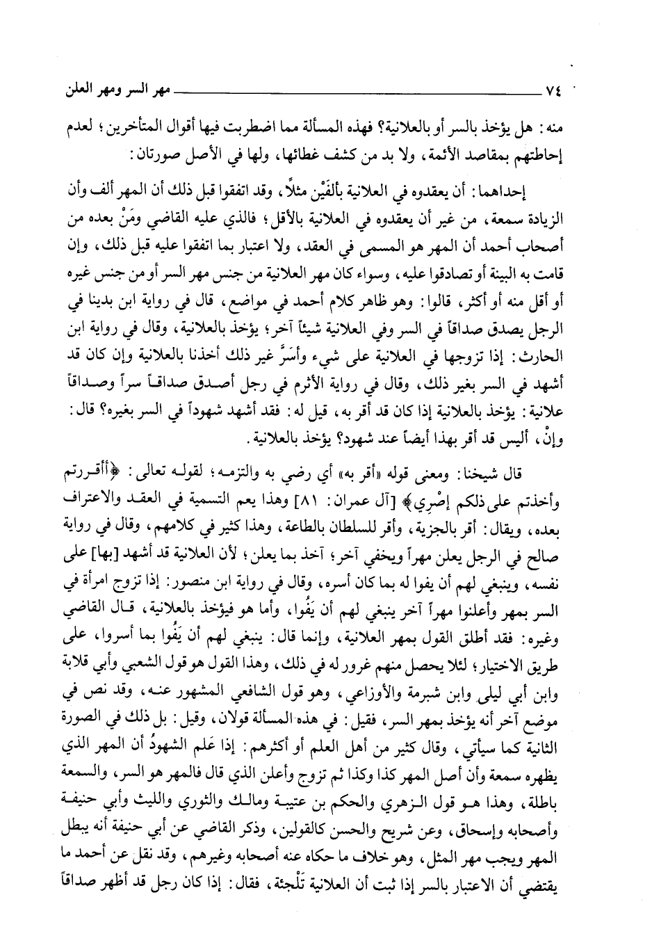 مِنْهُ: هَلْ يُؤْخَذُ بِالسِّرِّ أَوْ بِالْعَلَانِيَةِ؟ فَهَذِهِ الْمَسْأَلَةُ مِمَّا اضْطَرَبَتْ فِيهَا أَقْوَالُ الْمُتَأَخِّرِينَ؛ لِعَدَمِ إحَاطَتِهِمْ بِمَقَاصِدِ الْأَئِمَّةِ، وَلَا بُدَّ مِنْ كَشْفِ غِطَائِهَا، وَلَهَا فِي الْأَصْلِ صُورَتَانِ: إحْدَاهُمَا: أَنْ يَعْقِدُوهُ فِي الْعَلَانِيَةِ بِأَلْفَيْنِ مَثَلًا، وَقَدْ اتَّفَقُوا قَبْلَ ذَلِكَ أَنَّ الْمَهْرَ أَلْفٌ وَأَنَّ الزِّيَادَةَ سُمْعَةٌ، مِنْ غَيْرِ أَنْ يَعْقِدُوهُ فِي الْعَلَانِيَةِ بِالْأَقَلِّ؛ فَاَلَّذِي عَلَيْهِ الْقَاضِي وَمَنْ بَعْدَهُ مِنْ أَصْحَابِ أَحْمَدَ أَنَّ الْمَهْرَ هُوَ الْمُسَمَّى فِي الْعَقْدِ، وَلَا اعْتِبَارَ بِمَا اتَّفَقُوا عَلَيْهِ قَبْلَ ذَلِكَ، وَإِنْ قَامَتْ بِهِ الْبَيِّنَةُ أَوْ تَصَادَقُوا عَلَيْهِ، وَسَوَاءٌ كَانَ مَهْرُ الْعَلَانِيَةِ مِنْ جِنْسِ مَهْرِ السِّرِّ أَوْ مِنْ جِنْسِ غَيْرِهِ أَوْ أَقَلَّ مِنْهُ أَوْ أَكْثَرَ، قَالُوا: وَهُوَ ظَاهِرُ كَلَامِ أَحْمَدَ فِي مَوَاضِعَ.
