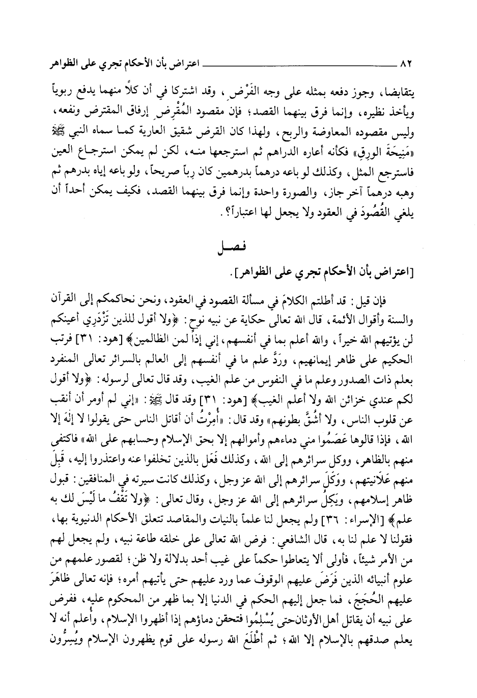 فَإِنْ قِيلَ: قَدْ أَطَلْتُمْ الْكَلَامَ فِي مَسْأَلَةِ الْقُصُودِ فِي الْعُقُودِ، وَنَحْنُ نُحَاكِمُكُمْ إلَى الْقُرْآنِ وَالسُّنَّةِ وَأَقْوَالِ الْأَئِمَّةِ، قَالَ اللَّهُ تَعَالَى حِكَايَةً عَنْ نَبِيِّهِ نُوحٍ: {وَلا أَقُولُ لِلَّذِينَ تَزْدَرِي أَعْيُنُكُمْ لَنْ يُؤْتِيَهُمُ اللَّهُ خَيْرًا اللَّهُ أَعْلَمُ بِمَا فِي أَنْفُسِهِمْ إِنِّي إِذًا لَمِنَ الظَّالِمِينَ} [هود: 31] فَرَتَّبَ الْحَكِيمُ عَلَى ظَاهِرِ إيمَانِهِمْ، وَرَدَّ عِلْمَ مَا فِي أَنْفُسِهِمْ إلَى الْعَالِمِ بِالسَّرَائِرِ تَعَالَى الْمُنْفَرِدِ بِعِلْمِ ذَاتِ الصُّدُورِ وَعِلْمِ مَا فِي النُّفُوسِ مِنْ عِلْمِ الْغَيْبِ، وَقَدْ قَالَ تَعَالَى لِرَسُولِهِ: {وَلا أَقُولُ لَكُمْ عِنْدِي خَزَائِنُ اللَّهِ وَلا أَعْلَمُ الْغَيْبَ} [هود: 31] وَقَدْ قَالَ - صَلَّى اللَّهُ عَلَيْهِ وَسَلَّمَ -: «إنِّي لَمْ أُومَرْ أَنْ أُنَقِّبَ عَنْ قُلُوبِ النَّاسِ، وَلَا أَشُقَّ بُطُونَهُمْ» وَقَدْ قَالَ: «أُمِرْت أَنْ أُقَاتِلَ النَّاسَ حَتَّى يَقُولُوا لَا إلَهَ إلَّا اللَّهُ، فَإِذَا قَالُوهَا عَصَمُوا مِنِّي دِمَاءَهُمْ وَأَمْوَالَهُمْ إلَّا بِحَقِّ الْإِسْلَامِ وَحِسَابُهُمْ عَلَى اللَّهِ» فَاكْتَفَى مِنْهُمْ بِالظَّاهِرِ، وَوَكَلَ سَرَائِرَهُمْ إلَى اللَّهِ، وَكَذَلِكَ فَعَلَ بِاَلَّذِينَ تَخَلَّفُوا عَنْهُ وَاعْتَذَرُوا إلَيْهِ، قَبِلَ مِنْهُمْ عَلَانِيَتَهُمْ، وَوَكَلَ سَرَائِرَهُمْ إلَى اللَّهِ عَزَّ وَجَلَّ، وَكَذَلِكَ كَانَتْ سِيرَتُهُ فِي الْمُنَافِقِينَ: قَبُولُ ظَاهِرِ إسْلَامِهِمْ، وَيَكِلُ سَرَائِرَهُمْ إلَى اللَّهِ عَزَّ وَجَلَّ، وَقَالَ تَعَالَى: {وَلا تَقْفُ مَا لَيْسَ لَكَ بِهِ عِلْمٌ} [الإسراء: 36] وَلَمْ يَجْعَلْ لَنَا عِلْمًا بِالنِّيَّاتِ وَالْمَقَاصِدِ تَتَعَلَّقُ الْأَحْكَامُ الدُّنْيَوِيَّةُ بِهَا، فَقَوْلُنَا لَا عِلْمَ لَنَا بِهِ.