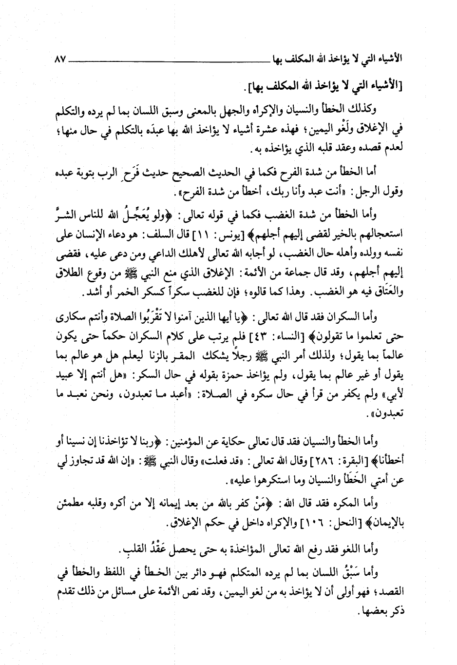 وَكَذَلِكَ الْخَطَأُ وَالنِّسْيَانُ وَالْإِكْرَاهُ وَالْجَهْلُ بِالْمَعْنَى وَسَبْقُ اللِّسَانِ بِمَا لَمْ يُرِدْهُ وَالتَّكَلُّمُ فِي الْإِغْلَاقِ وَلَغْوُ الْيَمِينِ؛ فَهَذِهِ عَشْرَةُ أَشْيَاءَ لَا يُؤَاخِذُ اللَّهُ بِهَا عَبْدَهُ بِالتَّكَلُّمِ فِي حَالٍ مِنْهَا؛ لِعَدَمِ قَصْدِهِ وَعَقْدِ قَلْبِهِ الَّذِي يُؤَاخِذُهُ بِهِ.