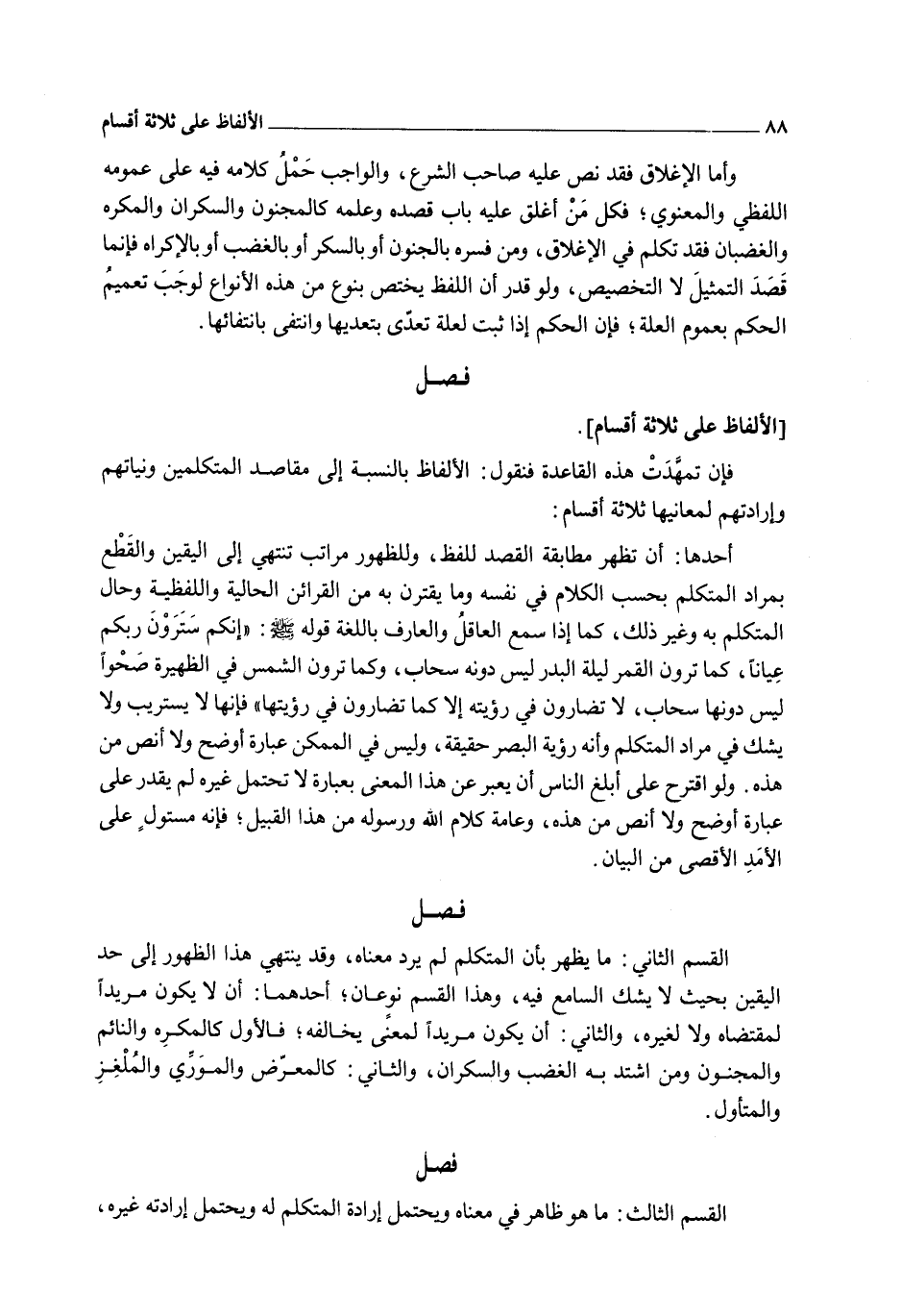 فَإِنْ تَمَهَّدَتْ هَذِهِ الْقَاعِدَةُ فَنَقُولُ: الْأَلْفَاظُ بِالنِّسْبَةِ إلَى مَقَاصِدِ الْمُتَكَلِّمِينَ وَنِيَّاتِهِمْ وَإِرَادَتِهِمْ لِمَعَانِيهَا ثَلَاثَةُ أَقْسَامٍ: أَحَدُهَا: أَنْ تُظْهِرَ مُطَابَقَةَ الْقَصْدِ لِلَّفْظِ، وَلِلظُّهُورِ مَرَاتِبُ تَنْتَهِي إلَى الْيَقِينِ وَالْقَطْعِ بِمُرَادِ الْمُتَكَلِّمِ بِحَسْبِ الْكَلَامِ فِي نَفْسِهِ وَمَا يَقْتَرِنُ بِهِ مِنْ الْقَرَائِنِ الْحَالِيَّةِ وَاللَّفْظِيَّةِ وَحَالُ الْمُتَكَلَّمِ بِهِ وَغَيْرُ ذَلِكَ، كَمَا إذَا سَمِعَ الْعَاقِلُ وَالْعَارِفُ بِاللُّغَةِ قَوْلَهُ - صَلَّى اللَّهُ عَلَيْهِ وَسَلَّمَ -: «إنَّكُمْ سَتَرَوْنَ رَبَّكُمْ عِيَانًا، كَمَا تَرَوْنَ الْقَمَرَ لَيْلَةَ الْبَدْرِ لَيْسَ دُونَهُ سَحَابٌ، وَكَمَا تَرَوْنَ الشَّمْسَ فِي الظَّهِيرَةِ صَحْوًا لَيْسَ دُونَهَا سَحَابٌ، لَا تُضَارُّونَ فِي رُؤْيَتِهِ إلَّا كَمَا تُضَارُّونَ فِي رُؤْيَتِهَا» فَإِنَّهَا لَا يَسْتَرِيبُ وَلَا يَشُكُّ فِي مُرَادِ الْمُتَكَلِّمِ وَأَنَّهُ رُؤْيَةُ الْبَصَرِ حَقِيقَةً، وَلَيْسَ فِي الْمُمْكِنِ عِبَارَةٌ أَوْضَحُ وَلَا أَنَصُّ مِنْ هَذِهِ. وَلَوْ اُقْتُرِحَ عَلَى أَبْلَغِ النَّاسِ أَنْ يُعَبِّرَ عَنْ هَذَا الْمَعْنَى بِعِبَارَةٍ لَا تَحْتَمِلُ غَيْرَهُ لَمْ يَقْدِرْ عَلَى عِبَارَةٍ أَوْضَحَ وَلَا أَنَصَّ مِنْ هَذِهِ، وَعَامَّةُ كَلَامِ اللَّهِ وَرَسُولِهِ مِنْ هَذَا الْقَبِيلِ؛ فَإِنَّهُ مُسْتَوْلٍ عَلَى الْأَمَدِ الْأَقْصَى مِنْ الْبَيَانِ.