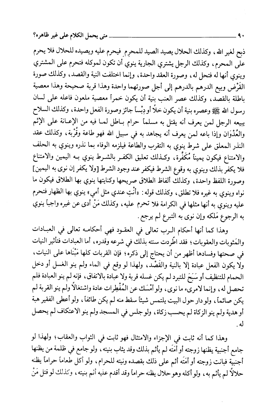 وَصُورَةُ اللَّفْظِ وَاحِدَةٌ، وَكَذَلِكَ أَلْفَاظُ الطَّلَاقِ صَرِيحُهَا وَكِنَايَتُهَا يَنْوِي بِهَا الطَّلَاقَ فَيَكُونُ مَا نَوَاهُ وَيَنْوِي بِهِ غَيْرَهُ فَلَا تَطْلُقُ، وَكَذَلِكَ قَوْلُهُ: " أَنْتِ عِنْدِي مِثْلُ أُمِّي " يَنْوِي بِهَا الظِّهَارَ فَتُحَرَّمُ عَلَيْهِ وَيَنْوِي بِهِ أَنَّهَا مِثْلُهَا فِي الْكَرَامَةِ فَلَا تُحَرَّمُ عَلَيْهِ، وَكَذَلِكَ مَنْ أَدَّى عَنْ غَيْرِهِ وَاجِبًا يَنْوِي بِهِ الرُّجُوعَ مَلَكَهُ وَإِنْ نَوَى بِهِ التَّبَرُّعَ لَمْ يَرْجِعْ.