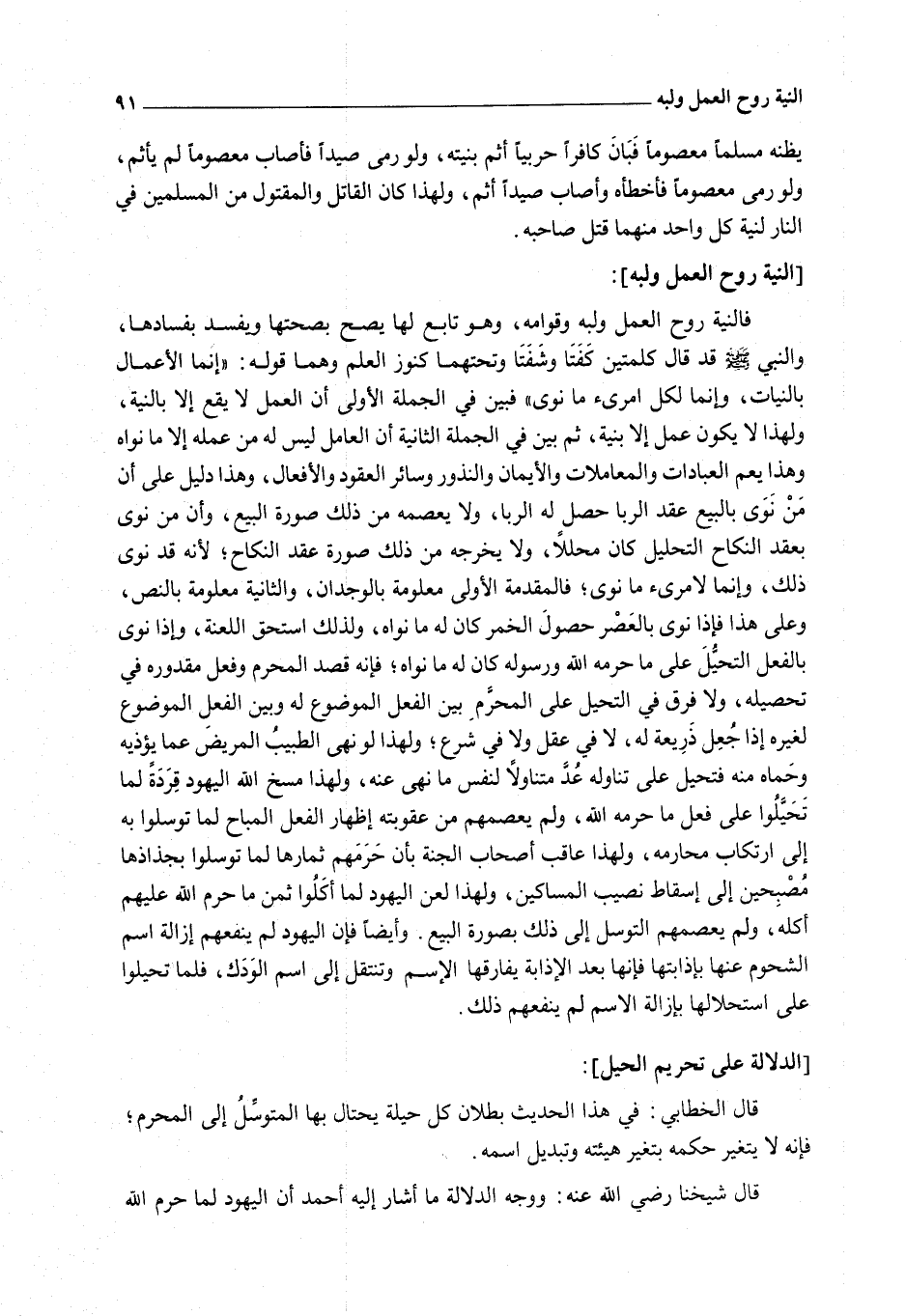 فَالنِّيَّةُ رُوحُ الْعَمَلِ وَلُبُّهُ وَقِوَامُهُ، وَهُوَ تَابِعٌ لَهَا يَصِحُّ بِصِحَّتِهَا وَيَفْسُدُ بِفَسَادِهَا، وَالنَّبِيُّ - صَلَّى اللَّهُ عَلَيْهِ وَسَلَّمَ - قَدْ قَالَ كَلِمَتَيْنِ كَفَتَا وَشَفَتَا وَتَحْتَهُمَا كُنُوزُ الْعِلْمِ وَهُمَا قَوْلُهُ: «إنَّمَا الْأَعْمَالُ بِالنِّيَّاتِ، وَإِنَّمَا لِكُلِّ امْرِئٍ مَا نَوَى» فَبَيَّنَ فِي الْجُمْلَةِ الْأُولَى أَنَّ الْعَمَلَ لَا يَقَعُ إلَّا بِالنِّيَّةِ، وَلِهَذَا لَا يَكُونُ عَمَلٌ إلَّا بِنِيَّةٍ، ثُمَّ بَيَّنَ فِي الْجُمْلَةِ الثَّانِيَةِ أَنَّ الْعَامِلَ لَيْسَ لَهُ مِنْ عَمَلِهِ إلَّا مَا نَوَاهُ وَهَذَا يَعُمُّ الْعِبَادَاتِ وَالْمُعَامَلَاتِ وَالْأَيْمَانَ وَالنُّذُورَ وَسَائِرَ الْعُقُودِ وَالْأَفْعَالِ، وَهَذَا دَلِيلٌ عَلَى أَنَّ مَنْ نَوَى بِالْبَيْعِ عَقْدَ الرِّبَا حَصَلَ لَهُ الرِّبَا، وَلَا يَعْصِمُهُ مِنْ ذَلِكَ صُورَةُ الْبَيْعِ، وَأَنَّ مَنْ نَوَى بِعَقْدِ النِّكَاحِ التَّحْلِيلَ كَانَ مُحَلَّلًا، وَلَا يُخْرِجُهُ مِنْ ذَلِكَ صُورَةُ عَقْدِ النِّكَاحِ؛ لِأَنَّهُ قَدْ نَوَى ذَلِكَ، وَإِنَّمَا لِامْرِئٍ مَا نَوَى؛ فَالْمُقَدِّمَةُ الْأُولَى مَعْلُومَةٌ بِالْوِجْدَانِ، وَالثَّانِيَةُ مَعْلُومَةٌ بِالنَّصِّ، وَعَلَى هَذَا فَإِذَا نَوَى بِالْعَصْرِ حُصُولَ الْخَمْرِ كَانَ لَهُ مَا نَوَاهُ، وَلِذَلِكَ اسْتَحَقَّ اللَّعْنَةَ، وَإِذَا نَوَى بِالْفِعْلِ التَّحَيُّلَ عَلَى مَا حَرَّمَهُ اللَّهُ وَرَسُولُهُ كَانَ لَهُ مَا نَوَاهُ؛ فَإِنَّهُ قَصَدَ الْمُحَرَّمَ وَفَعَلَ مَقْدُورَهُ فِي تَحْصِيلِهِ، وَلَا فَرْقَ فِي التَّحَيُّلِ عَلَى الْمُحَرَّمِ بَيْنَ الْفِعْلِ الْمَوْضُوعِ لَهُ وَبَيْنَ الْفِعْلِ الْمَوْضُوعِ لِغَيْرِهِ إذَا جُعِلَ ذَرِيعَةً لَهُ، لَا فِي عَقْلٍ وَلَا فِي شَرْعٍ؛ وَلِهَذَا لَوْ نَهَى الطَّبِيبُ الْمَرِيضَ عَمَّا يُؤْذِيهِ وَحَمَاهُ مِنْهُ فَتَحَيَّلَ عَلَى تَنَاوُلِهِ عُدَّ مُتَنَاوِلًا لِنَفْسِ مَا نَهَى عَنْهُ، وَلِهَذَا مَسَخَ اللَّهُ الْيَهُودَ قِرَدَةً لَمَّا تَحَيَّلُوا عَلَى فِعْلِ مَا حَرَّمَهُ اللَّهُ، وَلَمْ يَعْصِمْهُمْ مِنْ عُقُوبَتِهِ إظْهَارُ الْفِعْلِ الْمُبَاحِ لَمَّا تَوَسَّلُوا بِهِ إلَى ارْتِكَابِ مَحَارِمِهِ، وَلِهَذَا عَاقَبَ أَصْحَابَ الْجَنَّةِ بِأَنْ حَرَمَهُمْ ثِمَارَهَا لَمَّا تَوَسَّلُوا بِجُذَاذِهَا مُصْبِحِينَ إلَى إسْقَاطِ نَصِيبِ الْمَسَاكِينِ، وَلِهَذَا لَعَنَ الْيَهُودَ لَمَّا أَكَلُوا ثَمَنَ مَا حَرَّمَ اللَّهُ عَلَيْهِمْ أَكْلَهُ، وَلَمْ يَعْصِمْهُمْ التَّوَسُّلُ إلَى ذَلِكَ بِصُورَةِ الْبَيْعِ. وَأَيْضًا فَإِنَّ الْيَهُودَ لَمْ يَنْفَعْهُمْ إزَالَةُ اسْمِ الشُّحُومِ عَنْهَا بِإِذَابَتِهَا فَإِنَّهَا بَعْدَ الْإِذَابَةِ يُفَارِقُهَا الِاسْمُ وَتَنْتَقِلُ إلَى اسْمِ الْوَدَكِ، فَلَمَّا تُحِيلُوا عَلَى اسْتِحْلَالِهَا بِإِزَالَةِ الِاسْمِ لَمْ يَنْفَعْهُمْ ذَلِكَ.