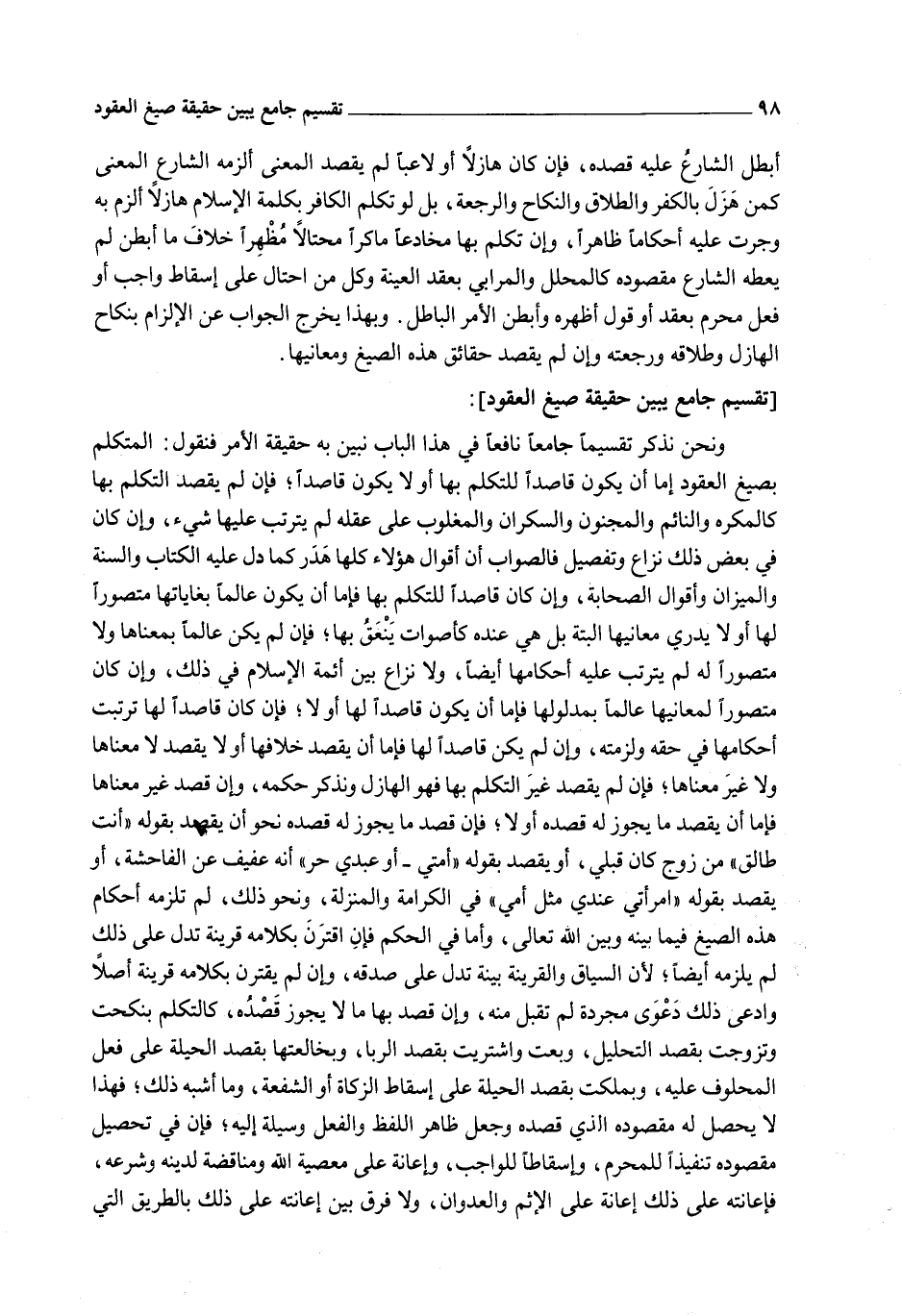 وَنَحْنُ نَذْكُرُ تَقْسِيمًا جَامِعًا نَافِعًا فِي هَذَا الْبَابِ نُبَيِّنُ بِهِ حَقِيقَةَ الْأَمْرِ فَنَقُولُ: الْمُتَكَلِّمُ بِصِيَغِ الْعُقُودِ إمَّا أَنْ يَكُونَ قَاصِدًا لِلتَّكَلُّمِ بِهَا أَوْ لَا يَكُونَ قَاصِدًا؛ فَإِنْ لَمْ يَقْصِدْ التَّكَلُّمَ بِهَا كَالْمُكْرَهِ وَالنَّائِمِ وَالْمَجْنُونِ وَالسَّكْرَانِ وَالْمَغْلُوبِ عَلَى عَقْلِهِ لَمْ يَتَرَتَّبْ عَلَيْهَا شَيْءٌ، وَإِنْ كَانَ فِي بَعْضِ ذَلِكَ نِزَاعٌ وَتَفْصِيلٌ فَالصَّوَابُ أَنَّ أَقْوَالَ هَؤُلَاءِ كُلَّهَا هَدَرٌ كَمَا دَلَّ عَلَيْهِ الْكِتَابُ وَالسُّنَّةُ وَالْمِيزَانُ وَأَقْوَالُ الصَّحَابَةِ، وَإِنْ كَانَ قَاصِدًا التَّكَلُّمَ بِهَا فَإِمَّا أَنْ يَكُونَ عَالِمًا بِغَايَاتِهَا مُتَصَوِّرًا لَهَا أَوْ لَا يَدْرِي مَعَانِيَهَا أَلْبَتَّةَ بَلْ هِيَ عِنْدَهُ كَأَصْوَاتٍ يَنْعَقُ بِهَا؛ فَإِنْ لَمْ يَكُنْ عَالِمًا بِمَعْنَاهَا وَلَا مُتَصَوِّرًا لَهُ لَمْ يَتَرَتَّبْ عَلَيْهِ أَحْكَامُهَا أَيْضًا، وَلَا نِزَاعَ بَيْنَ أَئِمَّةِ الْإِسْلَامِ فِي ذَلِكَ، وَإِنْ كَانَ مُتَصَوِّرًا لِمَعَانِيهَا عَالِمًا بِمَدْلُولِهَا فَإِمَّا أَنْ يَكُونَ قَاصِدًا لَهَا أَوْ لَا؛ فَإِنْ كَانَ قَاصِدًا لَهَا تَرَتَّبَتْ أَحْكَامُهَا فِي حَقِّهِ وَلَزِمَتْهُ، وَإِنْ لَمْ يَكُنْ قَاصِدًا لَهَا فَإِمَّا أَنْ يَقْصِدَ خِلَافَهَا أَوْ لَا يَقْصِدَ لَا مَعْنَاهَا وَلَا غَيْرَ مَعْنَاهَا؛ فَإِنْ لَمْ يَقْصِدْ غَيْرَ التَّكَلُّمِ بِهَا فَهُوَ الْهَازِلُ وَنَذْكُرُ حُكْمَهُ، وَإِنْ قَصَدَ غَيْرَ مَعْنَاهَا فَإِمَّا أَنْ يَقْصِدَ مَا يَجُوزُ لَهُ قَصْدُهُ أَوْ لَا؛ فَإِنْ قَصَدَ مَا يَجُوزُ لَهُ قَصْدُهُ نَحْوَ أَنْ يَقْصِدَ بِقَوْلِهِ " أَنْتِ طَالِقٌ " مِنْ زَوْجٍ كَانَ قَبْلِي، أَوْ يَقْصِدَ بِقَوْلِهِ " أَمَتِي - أَوْ عَبْدِي حُرٌّ " أَنَّهُ عَفِيفٌ عَنْ الْفَاحِشَةِ، أَوْ يَقْصِدَ بِقَوْلِهِ " امْرَأَتِي عِنْدِي مِثْلُ أُمِّي " فِي الْكَرَامَةِ وَالْمَنْزِلَةِ، وَنَحْوِ ذَلِكَ، لَمْ تَلْزَمْهُ أَحْكَامُ هَذِهِ الصِّيَغِ فِيمَا بَيْنَهُ وَبَيْنَ اللَّهِ تَعَالَى.