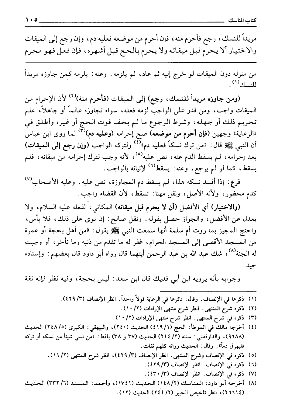 مُرِيدًا لِلنُّسُكِ، رَجَعَ، فَأَحْرَمَ مِنْهُ، فَإِنْ أَحْرَمَ مِنْ مَوْضِعِهِ فَعَلَيْهِ دَمٌ، وَإِنْ رَجَعَ إِلَى الْمِيقَاتِ. وَالِاخْتِيَارُ أَلَّا يُحْرِمَ قَبْلَ مِيقَاتِهِ وَلَا يُحْرِمُ بِالْحَجِّ قَبْلَ أَشْهُرِهِ، فَإِنْ فَعَلَ فَهُوَ مُحْرِمٌ