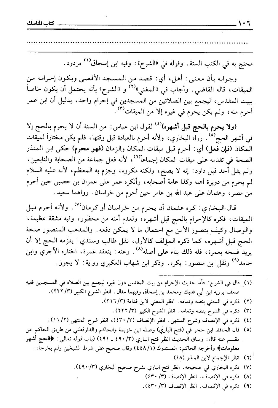 (وَلَا يُحْرِمُ بِالْحَجِّ قَبْلَ أَشْهُرِهِ) لِقَوْلِ ابْنِ عَبَّاسٍ: مِنَ السُّنَّةِ أَنْ لَا يُحْرِمَ بِالْحَجِّ إِلَّا فِي أَشْهُرِ الْحَجِّ. رَوَاهُ الْبُخَارِيُّ، وَلِأَنَّهُ أَحْرَمَ بِالْعِبَادَةِ قَبْلَ وَقْتِهَا فَلَمْ يَكُنْ مُخْتَارًا لِمِيقَاتِ الْمَكَانِ (فَإِنْ فَعَلَ) أَيْ: أَحْرَمَ قَبْلَ مِيقَاتِ الْمَكَانِ، وَالزَّمَانِ (فَهُوَ مُحَرَّمٌ) حَكَى ابْنُ الْمُنْذِرِ الصِّحَّةَ فِي تَقَدُّمِهِ عَلَى مِيقَاتِ الْمَكَانِ إِجْمَاعًا؛ لِأَنَّهُ فِعْلُ جَمَاعَةٍ مِنَ الصَّحَابَةِ وَالتَّابِعِينَ، وَلَمْ يَقُلْ أَحَدٌ قَبْلَ دَاوُدَ إِنَّهُ لَا يَصِحُّ، وَلَكِنَّهُ مَكْرُوهٌ، وَجَزَمَ بِهِ الْمُعْظَمُ؛ «لِأَنَّهُ - عَلَيْهِ السَّلَامُ - لَمْ يُحْرِمْ مِنْ دُوَيْرَةِ أَهْلِهِ» ، وَكَذَا عَامَّةُ أَصْحَابِهِ، وَأَنْكَرَهُ عُمَرُ عَلَى عِمْرَانَ بْنِ حُصَيْنٍ حِينَ أَحْرَمَ مِنْ مِصْرَ، وَعُثْمَانُ عَلَى عَبْدِ اللَّهِ بْنِ عَامِرٍ حِينَ أَحْرَمَ مِنْ خُرَاسَانَ رَوَاهُمَا سَعِيدٌ.