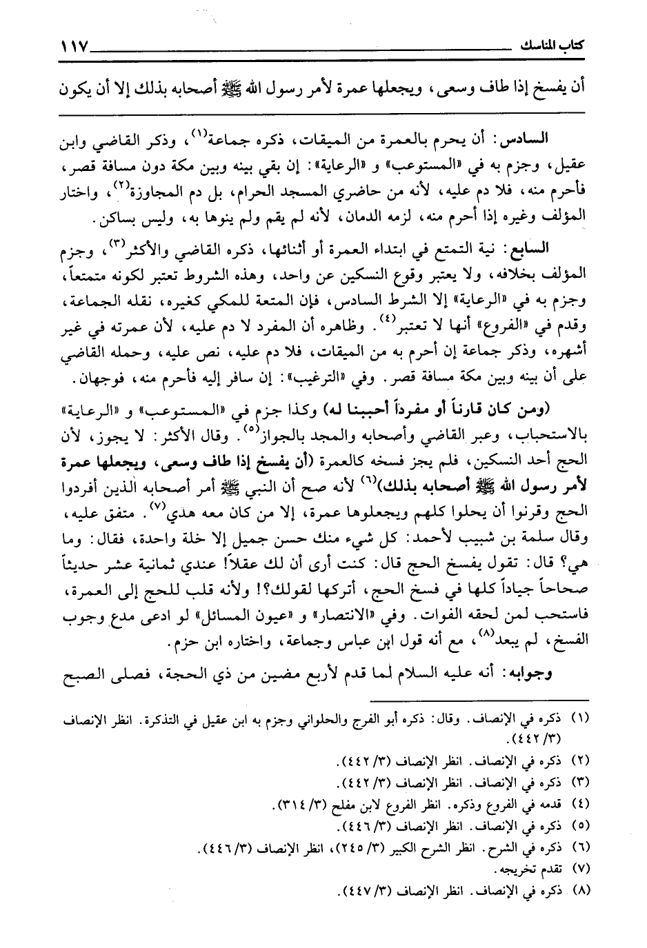 (وَمَنْ كَانَ قَارِنًا أَوْ مُفْرِدًا أَحْبَبْنَا لَهُ) وَكَذَا جَزَمَ فِي " الْمُسْتَوْعِبِ " وَ " الرِّعَايَةِ " بِالِاسْتِحْبَابِ، وَعَبَّرَ الْقَاضِي وَأَصْحَابُهُ، وَالْمَجْدُ بِالْجَوَازِ، وَقَالَ الْأَكْثَرُ: لَا يَجُوزُ؛ لِأَنَّ الْحَجَّ أَحَدُ النُّسُكَيْنِ فَلَمْ يَجُزْ فَسْخُهُ كَالْعُمْرَةِ (أَنْ يُفْسَخَ إِذَا طَافَ وَسَعَى، وَيَجْعَلَهَا عُمْرَةً لِأَمْرِ رَسُولِ اللَّهِ - صَلَّى اللَّهُ عَلَيْهِ وَسَلَّمَ - أَصْحَابَهُ بِذَلِكَ) ؛ لِأَنَّهُ صَحَّ «أَنَّ النَّبِيَّ - صَلَّى اللَّهُ عَلَيْهِ وَسَلَّمَ - أَمَرَ أَصْحَابَهُ الَّذِينَ أَفْرَدُوا الْحَجَّ وَقَرَنُوا أَنْ يُحِلُّوا كُلُّهُمْ وَيَجْعَلُوهَا عُمْرَةً، إِلَّا مَنْ كَانَ مَعَهُ هَدْيٌ» . مُتَّفَقٌ عَلَيْهِ. وَقَالَ سَلَمَةُ بْنُ شَبِيبٍ لِأَحْمَدَ: كُلُّ شَيْءٍ مِنْكَ حَسَنٌ جَمِيلٌ إِلَّا خَلَّةً وَاحِدَةً فَقَالَ: وَمَا هِيَ؟ قَالَ: تَقُولُ يُفْسَخُ الْحَجُّ قَالَ: كُنْتُ أَرَى أَنَّ لَكَ عَقْلًا! عِنْدِي ثَمَانِيَةَ عَشَرَ حَدِيثًا صِحَاحًا جِيَادًا كُلُّهَا فِي فَسْخِ الْحَجِّ أَتْرُكُهَا لِقَوْلِكَ؛! ، وَلِأَنَّهُ قَلْبٌ لِلْحَجِّ إِلَى الْعُمْرَةِ فَاسْتُحِبَّ لِمَنْ لَحِقَهُ الْفَوَاتُ، وَفِي " الِانْتِصَارِ " وَ " عُيُونِ الْمَسَائِلِ " لَوْ ادَّعَى مُدَّعٍ وُجُوبَ الْفَسْخِ لَمْ يَبْعُدْ مَعَ أَنَّهُ قَوْلُ ابْنِ عَبَّاسٍ، وَجَمَاعَةٍ، وَاخْتَارَهُ ابْنُ حَزْمٍ.