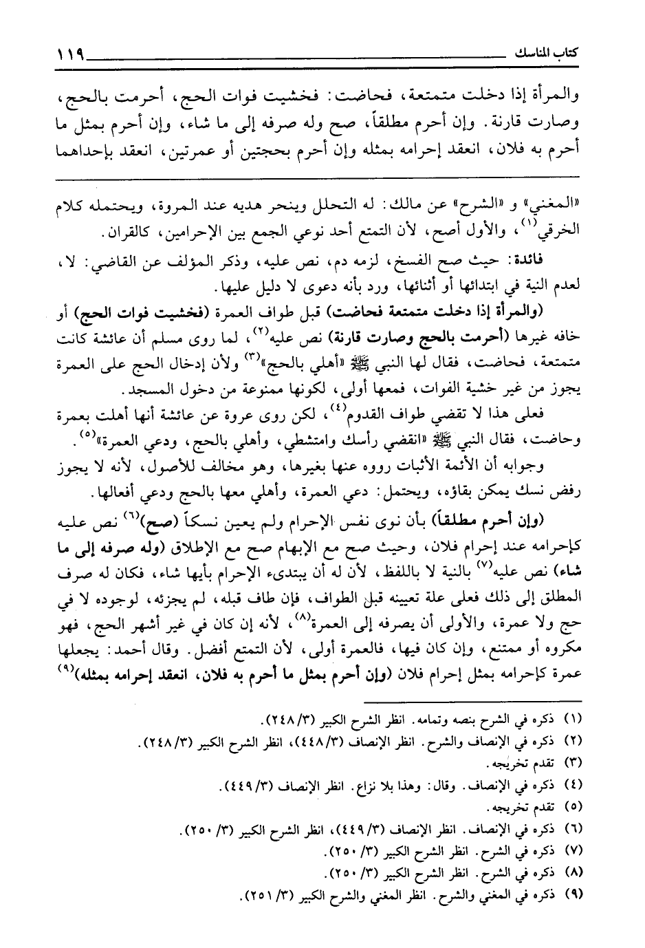 وَالْمَرْأَةُ إِذَا دَخَلَتْ مُتَمَتِّعَةً، فَحَاضَتْ فَخَشِيَتْ فَوَاتَ الْحَجِّ، أَحْرَمَتْ بِالْحَجِّ وَصَارَتْ قَارِنَةً. وَإِنْ أَحْرَمَ مُطْلَقًا، صَحَّ وَلَهُ صَرْفُهُ إِلَى مَا شَاءَ، وَإِنْ أَحْرَمَ بِمِثْلِ مَا أَحْرَمَ بِهِ فُلَانٌ انْعَقَدَ إِحْرَامُهُ بِمِثْلِهِ وَإِنْ أَحْرَمَ بِحَجَّتَيْنِ أَوْ عُمْرَتَيْنِ، انْعَقَدَ بِإِحْدَاهُمَا