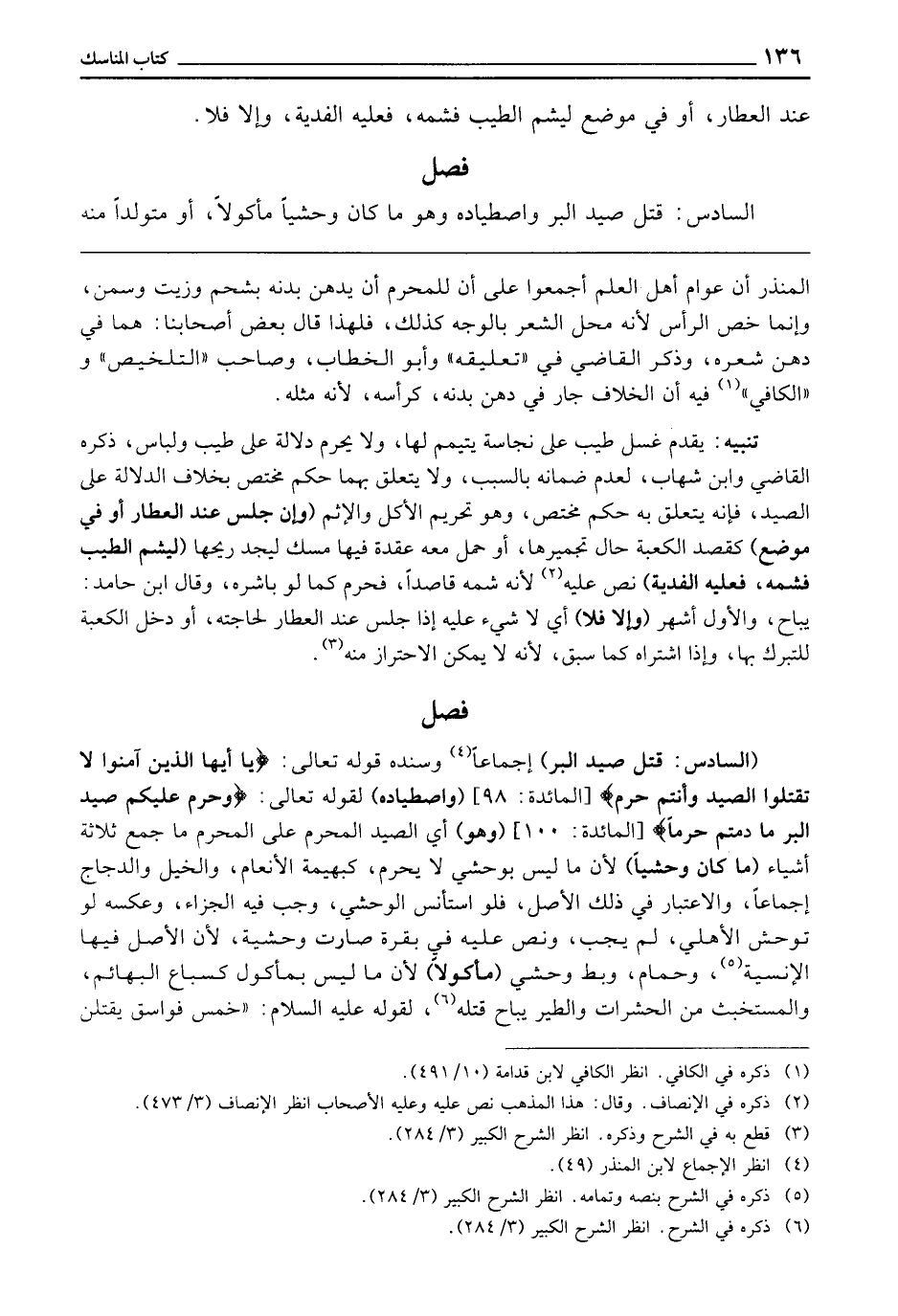 فَصْلٌ (السَّادِسُ: قَتْلُ صَيْدِ الْبَرِّ) إِجْمَاعًا وَسَنَدُهُ قَوْلُهُ - تَعَالَى - {يَا أَيُّهَا الَّذِينَ آمَنُوا لا تَقْتُلُوا الصَّيْدَ وَأَنْتُمْ حُرُمٌ} [المائدة: 95] (وَاصْطِيَادُهُ) لِقَوْلِهِ - تَعَالَى - {وَحُرِّمَ عَلَيْكُمْ صَيْدُ الْبَرِّ مَا دُمْتُمْ حُرُمًا} [المائدة: 96] (وَهُوَ) أَيِ: الصَّيْدُ الْمُحَرَّمُ عَلَى الْمُحْرِمِ مَا جَمَعَ ثَلَاثَةَ أَشْيَاءَ (مَا كَانَ وَحْشِيًّا) ؛ لِأَنَّ مَا لَيْسَ بِوَحْشِيٍّ لَا يَحْرُمُ كَبَهِيمَةِ الْأَنْعَامِ وَالْخَيْلِ وَالدَّجَاجِ إِجْمَاعًا، وَالِاعْتِبَارُ فِي ذَلِكَ الْأَصْلُ، فَلَوِ اسْتَأْنَسَ الْوَحْشِيُّ، وَجَبَ فِيهِ الْجَزَاءُ، وَعَكَسُهُ لَوْ تَوَحَّشَ الْأَهْلِيُّ لَمْ يَجِبْ، وَنَصَّ عَلَيْهِ، فِي بَقَرَةٍ صَارَتْ وَحْشِيَّةً؛ لَأَنَّ الْأَصْلَ فِيهَا الْإِنْسِيَّةُ، وَحَمَامٌ وَبَطٌّ وَحْشِيٌّ (مَأْكُولًا) ؛ لِأَنَّ مَا لَيْسَ بِمَأْكُولٍ كَسِبَاعِ الْبَهَائِمِ، وَالْمُسْتَخْبَثِ مِنَ الْحَشَرَاتِ وَالطَّيْرِ يُبَاحُ قَتْلُهُ لِقَوْلِهِ - عَلَيْهِ السَّلَامُ -: «خَمْسٌ فَوَاسِقُ يُقْتَلْنَ