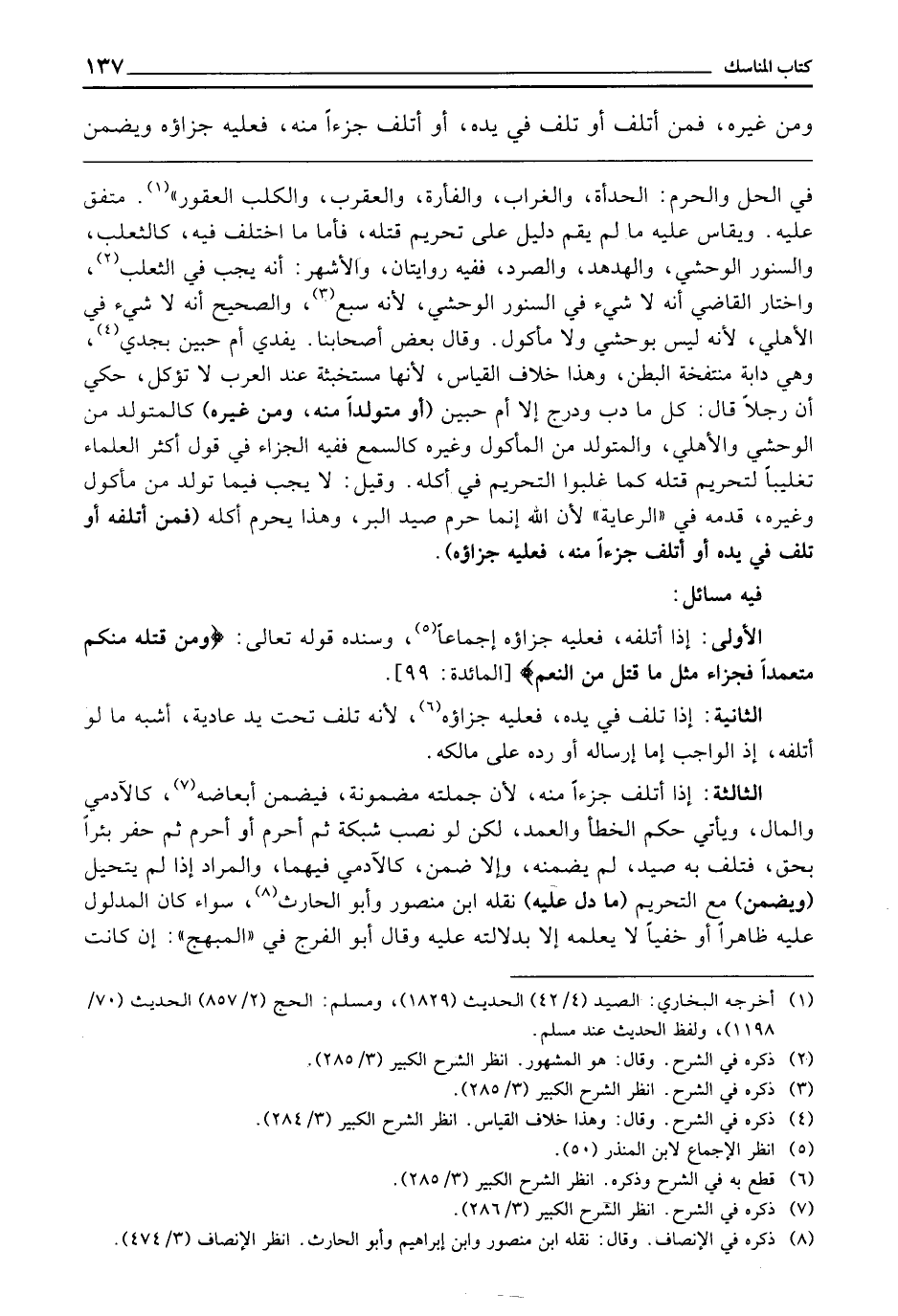الثَّالِثَةُ: إِذَا أَتْلَفَ جُزْءًا مِنْهُ؛ لِأَنَّ جُمْلَتَهُ مَضْمُونَةٌ، فَيَضْمَنُ أَبْعَاضَهُ، كَالْآدَمِيِّ وَالْمَالِ، وَيَأْتِي حُكْمُ الْخَطَأِ وَالْعَمْدِ، لَكِنْ لَوْ نَصَبَ شَبَكَةً، ثُمَّ أَحْرَمَ، أَوْ أَحْرَمَ ثُمَّ حَفَرَ بِئْرًا بِحَقٍّ، فَتَلَفَ بِهِ صَيْدٌ لَمْ يَضْمَنْهُ، وَإِلَّا ضَمِنَ كَالْآدَمِيِّ فِيهِمَا، وَالْمُرَادُ: إِذَا لَمْ يَتَحَيَّلْ (وَيَضْمَنُ) مَعَ التَّحْرِيمِ (مَا دَلَّ عَلَيْهِ) نَقَلَهُ ابن منصور وأبُو الْحَارِثِ سَوَاءٌ كَانَ الْمَدْلُولُ عَلَيْهِ ظَاهِرًا أَوْ خَفِيًّا لَا يَعْلَمُهُ إِلَّا بِدَلَالَتِهِ عَلَيْهِ، وَقَالَ أَبُو الْفَرَجِ فِي " الْمُبْهِجِ " إِنْ كَانَتِ