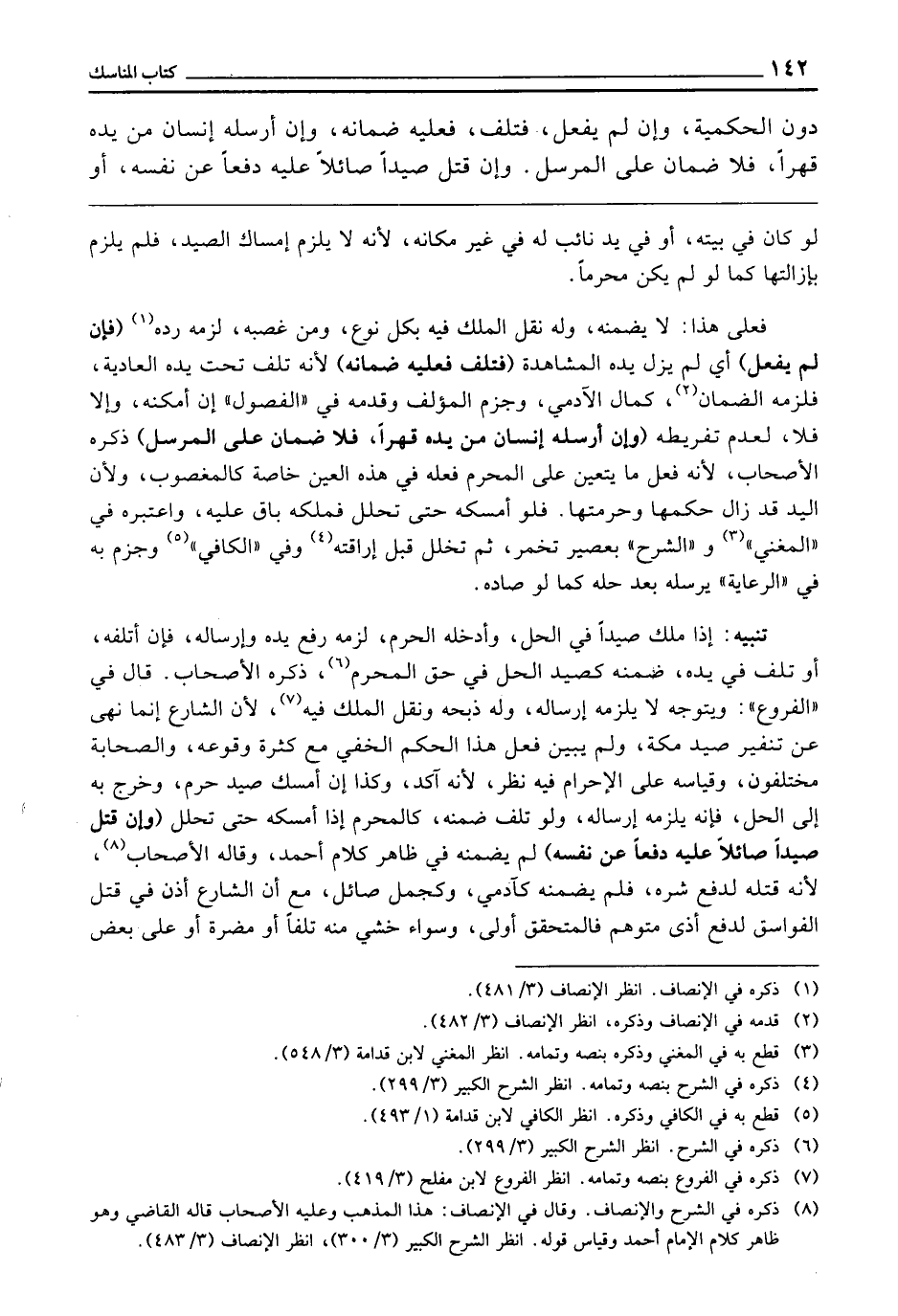 فَعَلَى هَذَا لَا يَضْمَنُهُ، وَلَهُ نَقْلُ الْمِلْكِ فِيهِ بِكُلِّ نَوْعٍ، وَمِنْ غَصَبَهُ لَزِمَهُ رَدُّهُ (فَإِنْ لَمْ يَفْعَلْ) أَيْ: لَمْ يُزِلْ يَدَهُ الْمُشَاهَدَةُ (فَتَلِفَ فَعَلَيْهِ ضَمَانُهُ) ؛ لِأَنَّهُ تَلِفَ تَحْتَ يَدِهِ الْعَادِيَّةِ فَلَزِمَهُ الضَّمَانُ كَمَالِ الْآدَمِيِّ، وَجَزَمَ الْمُؤَلِّفُ: وَقَدَّمَهُ فِي " الْفُصُولِ " إِنْ أَمْكَنَهُ، وَإِلَّا فَلَا لِعَدَمِ تَفْرِيطِهِ، (وَإِنْ أَرْسَلَهُ إِنْسَانٌ مِنْ يَدِهِ قَهْرًا فَلَا ضَمَانَ عَلَى الْمُرْسِلِ) ذَكَرَهُ الْأَصْحَابُ؛ لِأَنَّهُ فَعَلَ مَا يَتَعَيَّنُ عَلَى الْمُحْرِمِ فِعْلُهُ فِي هَذِهِ الْعَيْنِ خَاصَّةً كَالْمَغْصُوبِ، وَلِأَنَّ الْيَدَ قَدْ زَالَ حُكْمُهَا وَحُرْمَتُهَا، فَلَوْ أَمْسَكَهُ حَتَّى تَحَلَّلَ فَمِلْكُهُ بَاقٍ عَلَيْهِ، وَاعْتَبَرَهُ فِي " الْمُغْنِي " وَ " الشَّرْحِ " بِعَصِيرٍ تَخَمَّرَ، ثُمَّ تَخَلَّلَ قَبْلَ إِرَاقَتِهِ، وَفِي " الْكَافِي " وَجَزَمَ بِهِ فِي " الرِّعَايَةِ " يُرْسِلُهُ بَعْدَ حِلِّهِ كَمَا لَوْ صَادَهُ.
