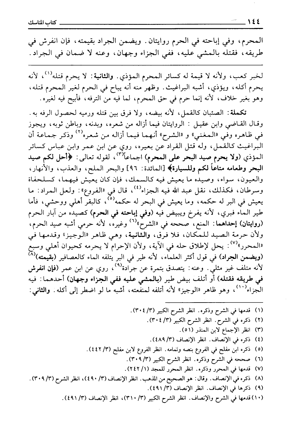 تَكْمِلَةٌ: الصِّئْبَانُ كَالْقَمْلِ؛ لِأَنَّهُ بَيْضُهُ، وَلَا فَرْقَ بَيْنَ قَتْلِهِ، وَرَمْيِهِ لِحُصُولِ الرَّفَهِ بِهِ. وَقَالَ الْقَاضِي وَابْنُ عَقِيلٍ: الرِّوَايَتَانِ فِيمَا أَزَالَهُ مِنْ شَعْرِهِ وَبَدَنِهِ، وَبَاطِنِ ثَوْبِهِ، وَيَجُوزُ فِي ظَاهِرِهِ، وَفِي " الْمُغْنِي " وَ " الشَّرْحِ " أَنَّهُمَا فِيمَا أَزَالَهُ مِنْ شَعْرِهِ، وَذَكَرَ جَمَاعَةٌ أَنَّ الْبَرَاغِيثَ كَالْقَمْلِ، وَلَهُ قَتْلُ الْقَرَادِ عَنْ بَعِيرِهِ، رُوِيَ عَنِ ابْنِ عُمَرَ، وَابْنِ عَبَّاسٍ كَسَائِرِ الْمُؤْذِي، (وَلَا يَحْرُمُ صَيْدُ الْبَحْرِ عَلَى الْمُحْرِمِ) إِجْمَاعًا لِقَوْلِهِ - تَعَالَى - {أُحِلَّ لَكُمْ صَيْدُ الْبَحْرِ وَطَعَامُهُ مَتَاعًا لَكُمْ وَلِلسَّيَّارَةِ} [المائدة: 96] وَالْبَحْرُ الْمِلْحُ، وَالْعَذْبُ، وَالْأَنْهَارُ، وَالْعُيُونُ سَوَاءٌ، وَصَيْدُهُ مَا يَعِيشُ فِيهِ كَالسَّمَكِ فَإِنْ كَانَ يَعِيشُ فِيهِمَا كَسُلَحْفَاةٍ، وَسَرَطَانٍ فَكَذَلِكَ نَقَلَ عَبْدُ اللَّهِ فِيهِ الْجَزَاءَ قَالَ فِي " الْفُرُوعِ ": وَلَعَلَّ الْمُرَادَ مَا يَعِيشُ فِي الْبَرِّ لَهُ حُكْمُهُ، وَمَا يَعِيشُ فِي الْبَحْرِ لَهُ حُكْمُهُ كَالْبَقَرِ أَهْلِيٌّ وَوَحْشِيٌّ، فَأَمَّا طَيْرُ الْمَاءِ فَبَرِّيٌّ؛ لِأَنَّهُ يُفْرِخُ، وَيَبِيضُ فِيهِ، (وَفِي إِبَاحَتِهِ فِي الْحَرَمِ) كَصَيْدِهِ مِنْ آبَارِ الْحَرَمِ (رِوَايَتَانِ) إِحْدَاهُمَا: الْمَنْعُ صَحَّحَهُ فِي " الشَّرْحِ " وَغَيْرِهِ؛ لِأَنَّهُ حَرَمِيٌّ أَشَبَهَ صَيْدَ الْحَرَمِ، وَلِأَنَّ حُرْمَةَ الصَّيْدِ لِلْمَكَانِ فَلَا فَرْقَ، وَالثَّانِيَةُ، وَهِيَ ظَاهِرُ " الْوَجِيزِ " وَقَدَّمَهَا فِي " الْمُحَرَّرِ ": يَحِلُّ لِإِطْلَاقِ حِلِّهِ فِي الْآيَةِ، وَلِأَنَّ الْإِحْرَامَ لَا يُحَرِّمُهُ كَحَيَوَانٍ أَهْلِيٍ وَسَبُعٍ (وَيَضْمَنُ الْجَرَادَ) فِي قَوْلِ أَكْثَرِ الْعُلَمَاءِ؛ لِأَنَّهُ طَيْرٌ فِي الْبَرِّ يُتْلِفُهُ الْمَاءُ كَالْعَصَافِيرِ (بِقِيمَتِهِ) ؛ لِأَنَّهُ مُتْلَفٌ غَيْرُ مِثْلِيٍّ، وَعَنْهُ: يَتَصَدَّقُ بِتَمْرَةٍ عَنْ جَرَادَةٍ رُوِيَ عَنِ ابْنِ عُمَرَ (فَإِنِ انْفَرَشَ فِي طَرِيقِهِ فَقَتَلَهُ) أَوْ أَتْلَفَ بَيْضَ طَيْرٍ (بِالْمَشْيِ عَلَيْهِ فَفِي الْجَزَاءِ وَجْهَانِ) أَحَدُهُمَا: فِيهِ الْجَزَاءُ، وَهُوَ ظَاهِرُ " الْوَجِيزِ "؛ لِأَنَّهُ أَتْلَفَهُ لِمَنْفَعَتِهِ أَشْبَهُ مَا لَوِ اضْطُرَّ إِلَى أَكْلِهِ، وَالثَّانِي: