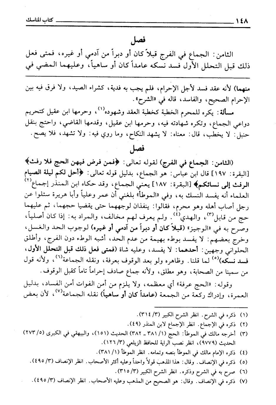 فَصْلٌ الثَّامِنُ: الْجِمَاعُ فِي الْفَرْجِ قُبُلًا كَانَ أَوْ دُبُرًا مِنْ آدَمِيٍّ أَوْ غَيْرِهِ، فَمَتَى فَعَلَ ذَلِكَ قَبْلَ التَّحَلُّلِ الْأَوَّلِ فَسَدَ نُسُكُهُ عَامِدًا كَانَ أَوْ سَاهِيًا، وَعَلَيْهِمَا الْمُضِيُّ فِي