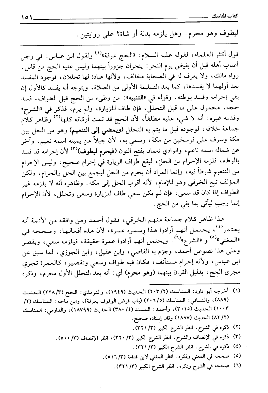 ـــــــــــــــــــــــــــــQقَوْلِ أَكْثَرِ الْعُلَمَاءِ لِقَوْلِهِ - عَلَيْهِ السَّلَامُ -: «الْحَجُّ عَرَفَةُ» وَلِقَوْلِ ابْنِ عَبَّاسٍ فِي رَجُلٍ أَصَابَ أَهْلَهُ قَبْلَ أَنْ يُفِيضَ يَوْمَ النَّحْرِ: يَنْحَرَانِ جَزُورًا بَيْنَهُمَا، وَلَيْسَ عَلَيْهِ الْحَجُّ مِنْ قَابِلٍ. رَوَاهُ مَالِكٌ، وَلَا يُعْرَفُ لَهُ فِي الصَّحَابَةِ مُخَالِفٌ، وَلِأَنَّهَا عِبَادَةٌ لَهَا تَحَلُّلَانِ، فَوُجُودُ الْمُفْسِدِ بَعْدَ أَوَّلِهِمَا لَا يُفْسِدُهَا، كَمَا بَعْدَ التَّسْلِيمَةِ الْأُولَى مِنَ الصَّلَاةِ، وَيَتَوَجَّهُ أَنَّهُ يَفْسُدُ كَالْأَوَّلِ إِنْ بَقِيَ إِحْرَامُهُ، وَفَسَدَ بِوَطْئِهِ، وَقَوْلِهِ فِي " التَّنْبِيهِ ": مَنْ وَطِئَ مِنَ الْحَجِّ قَبْلَ الطَّوَافِ، فَسَدَ حَجُّهُ، مَحْمُولٌ عَلَى مَا قَبْلَ التَّحَلُّلِ، فَإِنْ طَافَ لِلزِّيَارَةِ، وَلَمْ يَرْمِ، فَذَكَرَ فِي " الشَّرْحِ " وَقَدَّمَهُ غَيْرُهُ: أَنَّهُ لَا شَيْءَ عَلَيْهِ مُطْلَقًا؛ لِأَنَّ الْحَجَّ قَدْ تَمَّتْ أَرْكَانُهُ كُلُّهَا. وَظَاهِرُ كَلَامِ جَمَاعَةٍ خِلَافُهُ، لِوُجُودِهِ قَبْلَ مَا يَتِمُّ بِهِ التَّحَلُّلُ، (وَيَمْضِي إِلَى التَّنْعِيمِ) وَهُوَ مِنَ الْحِلِّ بَيْنَ مَكَّةَ، وَسَرِفَ عَلَى فَرْسَخَيْنِ مِنْ مَكَّةَ، وَسُمِّي بِهِ؛ لِأَنَّ جَبَلًا عَنْ يَمِينِهِ اسْمُهُ نُعَيْمٌ، وَآخَرُ عَنْ شِمَالِهِ اسْمُهُ نَاعِمٌ، وَالْوَادِي نَعْمَانُ بِفَتْحِ النُّونِ (فَيُحْرِمَ لِيَطُوفَ) ؛ لِأَنَّ إِحْرَامَهُ قَدْ فَسَدَ بِالْوَطْءِ فَلَزِمَهُ الْإِحْرَامُ مِنَ الْحِلِّ؛ لِيَقَعَ طَوَافُ الزِّيَارَةِ فِي إِحْرَامٍ صَحِيحٍ، وَلَيْسَ الْإِحْرَامُ مِنَ التَّنْعِيمِ شَرْطًا فِيهِ، وَإِنَّمَا الْمُرَادُ أَنْ يُحْرِمَ مِنَ الْحِلِّ لِيَجْمَعَ بَيْنَ الْحِلِّ وَالْحَرَامِ، وَلَكِنَّ الْمُؤَلِّفَ تَبِعَ الْخِرَقِيَّ، وَهُوَ لِلْإِمَامِ؛ لِأَنَّهُ أَقْرَبُ الْحِلِّ إِلَى مَكَّةَ. وَظَاهِرُهُ أَنَّهُ لَا يَلْزَمُهُ غَيْرُ الطَّوَافِ إِذَا كَانَ قَدْ سَعَى، فَإِنْ لَمْ يَكُنْ سَعي طَافَ لِلزِّيَارَةِ وَسَعَى وَتَحَلَّلَ؛ لِأَنَّ الْإِحْرَامَ إِنَّمَا وَجَبَ لِيَأْتِيَ بِمَا بَقِيَ مِنَ الْحَجِّ.