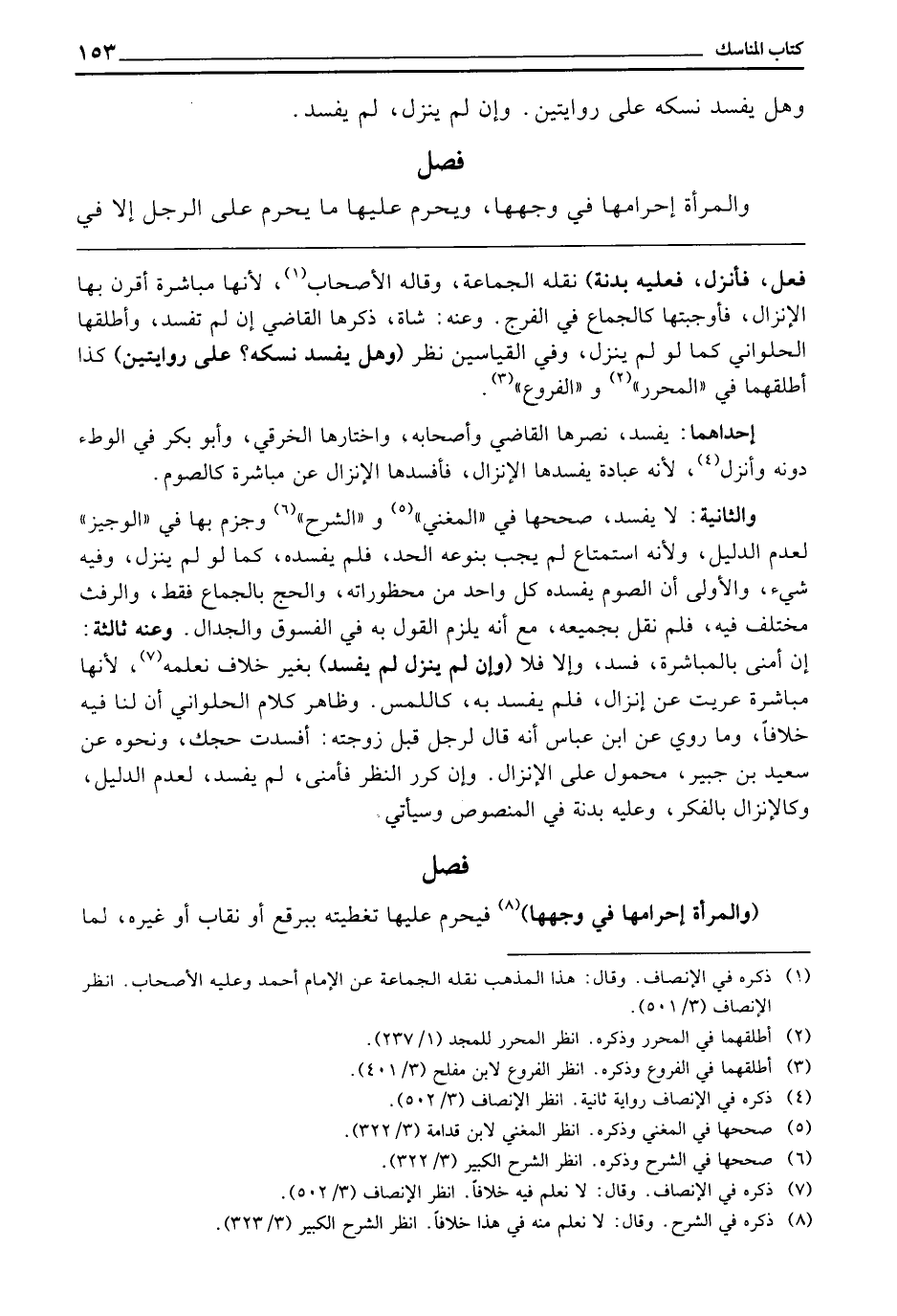 ـــــــــــــــــــــــــــــQفَعَلَ فَأَنْزَلَ فَعَلَيْهِ بَدَنَةٌ) نَقَلَهُ الْجَمَاعَةُ، وَقَالَهُ الْأَصْحَابُ؛ لِأَنَّهَا مُبَاشَرَةٌ أُقْرِنَ بِهَا الْإِنْزَالُ فَأَوْجَبَتْهَا كَالْجِمَاعِ فِي الْفَرْجِ، وَعَنْهُ: شَاةٌ ذَكَرَهَا الْقَاضِي إِنْ لَمْ تَفْسُدْ وأطلقها الحلواني كَمَا لَوْ لَمْ يُنْزِلْ، وَفِي الْقِيَاسَيْنِ نَظَرٌ. (وَهَلْ يَفْسُدُ نُسُكُهُ عَلَى رِوَايَتَيْنِ) كَذَا أَطْلَقَهُمَا فِي " الْمُحَرَّرِ " وَ " الْفُرُوعِ ".