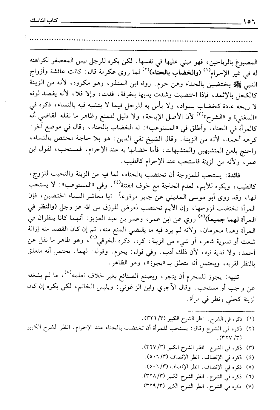 فَائِدَةٌ: يُسْتَحَبُّ لِلْمُزَوَّجَةِ أَنْ تَخْتَضِبَ بِالْحِنَّاءِ لِمَا فِيهِ مِنَ الزِّينَةِ، وَالتَّحَبُّبِ لِلزَّوْجِ كَالطِّيبِ، وَيُكْرَهُ لِلْأَيِّمِ، لِعَدَمِ الْحَاجَةِ، مَعَ خَوْفِ الْفِتْنَةِ، وَفِي " الْمُسْتَوْعِبِ " لَا يُسْتَحَبُّ لَهَا، وَقَدْ رَوَى أَبُو مُوسَى الْمَدِينِيُّ عَنْ جَابِرٍ مَرْفُوعًا: «يَا مَعَاشِرَ النِّسَاءِ اخْتَضِبْنَ فَإِنَّ الْمَرْأَةَ تَخْتَضِبُ لِزَوْجِهَا، وَإِنَّ الْأَيِّمَ تَخْتَضِبُ تَعَرَّضُ لِلرِّزْقِ مِنَ اللَّهِ - عَزَّ وَجَلَّ -» (وَالنَّظَرُ فِي الْمِرْآةِ لَهُمَا جَمِيعًا) رُوِيَ عَنِ ابْنِ عُمَرَ، وَعُمَرَ بْنِ عَبْدِ الْعَزِيزِ أَنَّهُمَا كَانَا يَنْظُرَانِ فِي الْمِرْآةِ، وَهُمَا مُحْرِمَانِ، وَلِأَنَّهُ لَمْ يَرِدْ فِيهِ مَا يَقْتَضِي الْمَنْعَ مِنْهُ، ثُمَّ إِنْ كَانَ الْقَصْدُ مِنْهُ إِزَالَةَ شَعَثٍ أَوْ تَسْوِيَةَ شَعْرٍ أَوْ شَيْءٍ مِنَ الزِّينَةِ، كُرِهَ. ذَكَرَهُ الْخِرَقِيُّ، وَهُوَ ظَاهِرُ مَا نُقِلَ عَنْ أَحْمَدَ، وَلَا فِدْيَةَ فِيهِ؛ لِأَنَّ ذَلِكَ أَدَبٌ، وَفِي قَوْلٍ: يَحْرُمُ، وَقَوْلُهُ: (لَهُمَا) يَحْتَمِلُ أَنَّهُ متعلق بالنظر لِقُرْبِهِ، وَيُحْتَمَلُ أَنَّهُ مُتَعَلِّقٌ بِـ " يَجُوزُ " وَهُوَ الظَّاهِرُ.