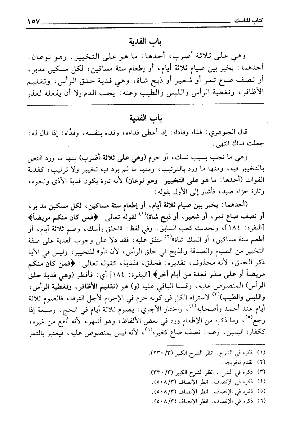 بَابُ الْفِدْيَةِ وَهِيَ عَلَى ثَلَاثَةِ أَضْرُبٍ، أَحَدُهَا: مَا هُوَ عَلَى التَّخْيِيرِ، وَهُوَ نَوْعَانِ: أَحَدُهُمَا: يُخَيَّرُ بَيْنَ صِيَامِ ثَلَاثَةِ أَيَّامٍ، أَوْ إِطْعَامِ سِتَّةِ مَسَاكِينَ، لِكُلِّ مِسْكِينٍ مُدُّ بُرٍّ، أَوْ نِصْفُ صَاعٍ تَمْرٍ أَوْ شَعِيرٍ أَوْ ذَبْحُ شَاةٍ، وَهِيَ فِدْيَةُ حَلْقِ الرَّأْسِ، وَتَقْلِيمِ الْأَظَّافِرِ، وَتَغْطِيَةِ الرَّأْسِ وَاللُّبْسِ وَالطِّيبِ وَعَنْهُ: يَجِبُ الدَّمُ إِلَّا أَنْ يَفْعَلَهُ لِعُذْرٍ