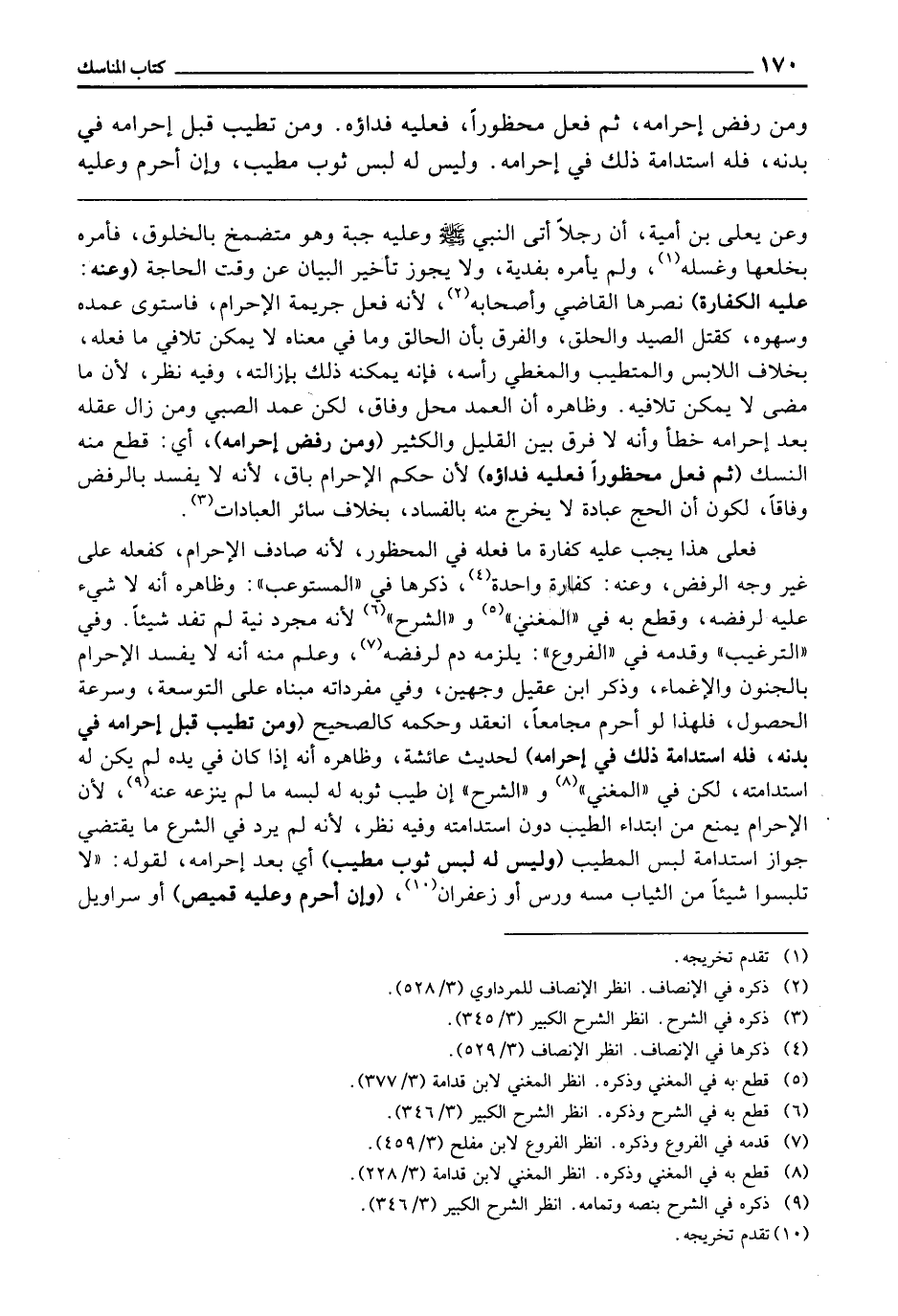 فَعَلَى هَذَا يَجِبُ عَلَيْهِ كَفَّارَةُ مَا فَعَلَهُ فِي الْمَحْظُورِ؛ لِأَنَّهُ صَادَفَ الْإِحْرَامَ كَفِعْلِهِ عَلَى غَيْرِ وَجْهِ الرَّفْضِ، وَعَنْهُ: كَفَارَّةٌ وَاحِدَةٌ ذَكَرَهَا فِي " الْمُسْتَوْعِبِ ". وَظَاهِرُهُ أَنَّهُ لَا شَيْءَ عَلَيْهِ لِرَفْضِهِ، وَقَطَعَ بِهِ فِي " الْمُغْنِي " وَ " الشَّرْحِ "؛ لِأَنَّهُ مُجَرَّدُ نِيَّةٍ لَمْ تُفِدْ شَيْئًا، وَفِي التَّرْغِيبِ، وَقَدَّمَهُ فِي " الْفُرُوعِ ": يَلْزَمُهُ دَمٌ لِرَفْضِهِ، وَعُلِمَ مِنْهُ أَنَّهُ لَا يَفْسُدُ الْإِحْرَامُ بِالْجُنُونِ، وَالْإِغْمَاءِ، وَذَكَرَ ابْنُ عَقِيلٍ وَجْهَيْنِ، وَفِي مُفْرَدَاتِهِ مَبْنَاهُ عَلَى التَّوْسِعَةِ، وَسُرْعَةُ الْحُصُولِ فَلِهَذَا لَوْ أَحْرَمَ مُجَامِعًا انْعَقَدَ، وَحُكْمُهُ كَالصَّحِيحِ، (وَمَنْ تَطَيَّبَ قَبْلَ إِحْرَامِهِ فِي بَدَنِهِ فَلَهُ اسْتِدَامَةُ ذَلِكَ فِي إِحْرَامِهِ) لِحَدِيثِ عَائِشَةَ، وَظَاهِرُهُ أَنَّهُ إِذَا كَانَ فِي يَدِهِ لَمْ يَكُنْ لَهُ اسْتَدَامَتُهُ، لَكِنْ فِي " الْمُغْنِي " وَ " الشَّرْحِ " إِنْ طَيَّبَ ثَوْبَهُ لَهُ لُبْسُهُ مَا لَمْ يَنْزِعْهُ عَنْهُ، لِأَنَّ الْإِحْرَامَ يَمْنَعُ مِنِ ابْتِدَاءِ الطِّيبِ دُونَ اسْتَدَامَتِهِ، وَفِيهِ نَظَرٌ؛ لِأَنَّهُ لَمْ يَرِدْ فِي الشَّرْعِ مَا يَقْتَضِي جَوَازَ اسْتِدَامَةِ لُبْسِ الْمُطَيَّبِ، (وَلَيْسَ لَهُ لُبْسُ ثَوْبٍ مُطَيَّبٍ) أَيْ: بَعْدَ إِحْرَامِهِ؛ لِقَوْلِهِ: «لَا تَلْبَسُوا شَيْئًا مِنَ الثِّيَابِ مَسَّهُ وَرْسٌ أَوْ زَعْفَرَانُ» (وَإِنْ أَحْرَمَ، وَعَلَيْهِ قَمِيصٌ) أَوْ سَرَاوِيلُ
