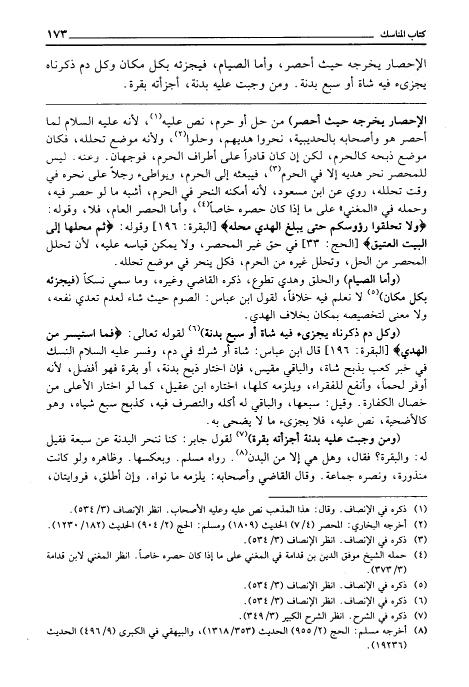 ـــــــــــــــــــــــــــــQالْإِحْصَارِ يُخْرِجُهُ حَيْثُ أُحْصِرَ) مِنْ حِلٍّ أَوْ حَرَمٍ، نَصَّ عَلَيْهِ؛ لِأَنَّهُ - عَلَيْهِ السَّلَامُ - لَمَّا أُحْصِرَ هُوَ وَأَصْحَابُهُ بِالْحُدَيْبِيَةِ نَحَرُوا هَدْيَهُمْ، وَحَلُّوا، وَلِأَنَّهُ مَوْضِعُ تَحَلُّلِهِ فَكَانَ مَوْضِعَ ذَبْحِهِ كَالْحَرَمِ، لَكِنْ إِنْ كَانَ قَادِرًا عَلَى أَطْرَافِ الْحَرَمِ فَوَجْهَانِ، وَعَنْهُ: لَيْسَ لِلْمُحْصَرِ نَحْرُ هَدْيِهِ إِلَّا فِي الْحَرَمِ فَيَبْعَثُهُ إِلَى الْحَرَمِ، وَيُوَاطِئُ رَجُلًا عَلَى نَحْرِهِ فِي وَقْتِ تَحَلُّلِهِ، رُوِيَ عَنِ ابْنِ مَسْعُودٍ؛ لِأَنَّهُ أَمْكَنَهُ النَّحْرُ فِي الْحَرَمِ أَشْبَهُ مَا لَوْ حُصِرَ فِيهِ، وَحَمَلَهُ فِي " الْمُغْنِي " عَلَى مَا إِذَا كَانَ حَصْرُهُ خَاصًّا، وَأَمَّا الْحَصْرُ الْعَامُّ فَلَا، وَقَوْلُهُ {وَلا تَحْلِقُوا رُءُوسَكُمْ حَتَّى يَبْلُغَ الْهَدْيُ مَحِلَّهُ} [البقرة: 196] وَقَوْلُهُ {ثُمَّ مَحِلُّهَا إِلَى الْبَيْتِ الْعَتِيقِ} [الحج: 33] فِي حق غير الْمُحْصَرِ، وَلَا يُمْكِنُ قِيَاسُهُ عَلَيْهِ؛ لِأَنَّ تَحَلُّلَ الْمَحْصَرِ مِنَ الْحِلِّ، وَتَحَلُّلَ غَيْرِهِ مِنَ الْحَرَمِ فَكَلٌّ يَنْحَرُ فِي مَوْضِعِ تَحَلُّلِهِ.