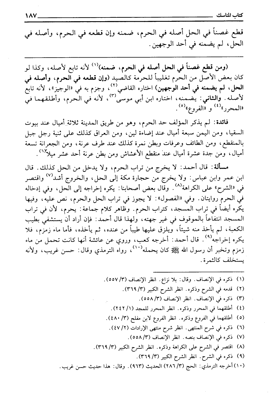 فَائِدَةٌ: لَمْ يَذْكُرِ الْمُؤَلِّفُ حَدَّ الْحَرَمِ، وَهُوَ مِنْ طَرِيقِ الْمَدِينَةِ ثَلَاثَةُ أَمْيَالٍ عِنْدَ بُيُوتِ السُّقْيَا، وَمِنَ الْيَمَنِ سَبْعَةُ أَمْيَالٍ عِنْدَ إِضَاءَةِ لِينٍ، وَمِنَ الْعِرَاقِ كَذَلِكَ عَلَى ثَنِيَّةِ زُحَلَ جَبَلٍ بِالْمُنْقَطِعِ، وَمِنَ الطَّائِفِ وَعَرَفَاتٍ وَبَطْنِ نَمِرَةَ كَذَلِكَ عِنْدَ طَرَفِ عُرَنَةَ، وَمِنَ الْجِعْرَانَةُ تِسْعَةُ أَمْيَالٍ، وَمِنْ جُدَّةَ عَشَرَةُ أَمْيَالٍ عند مُنْقَطِعُ الْأَعْشَاشِ، وَمِنْ بَطْنِ عُرَنَةَ أَحَدَ عَشَرَ مِيلًا.