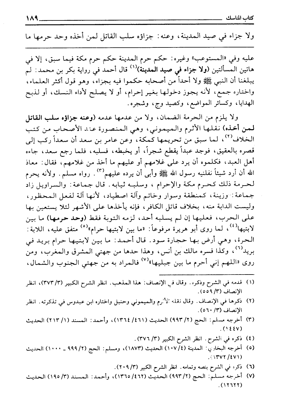 وَلَا يَلْزَمُ مِنَ الْحُرْمَةِ الضَّمَانُ، وَلَا مِنْ عَدَمِهَا عَدَمُهُ (وَعَنْهُ: جَزَاؤُهُ سَلَبُ الْقَاتِلِ لِمَنْ أَخَذَهُ) نَقَلَهَا الْأَثْرَمُ، وَالْمَيْمُونِيُّ، وَهِيَ الْمَنْصُورَةُ عِنْدَ الْأَصْحَابِ مِنْ كُتِبِ الْخِلَافِ لِمَا سَبَقَ مِنْ تَحْرِيمِهَا كَمَكَّةَ، وَعَنْ عَامِرِ بْنِ سَعْدٍ أَنَّ سَعْدًا رَكِبَ إِلَى قَصْرِهِ بِالْعَقِيقِ فَوَجَدَ عَبْدًا يَقْطَعُ شَجَرًا، أَوْ يَخْبِطُهُ، فَسَلَبَهُ، فَلَمَّا رَجَعَ سَعْدٌ جَاءَهُ أَهْلُ الْعَبْدِ فَكَلَّمُوهُ أَنْ يَرُدَّ عَلَى غُلَامِهِمْ أَوْ عَلَيْهِمْ مَا أَخَذَ مِنْ غُلَامِهِمْ، فَقَالَ: مَعَاذَ اللَّهِ أَنْ أَرُدَّ شَيْئًا نَفَّلَنِيهِ رَسُولُ اللَّهِ - صَلَّى اللَّهُ عَلَيْهِ وَسَلَّمَ - وَأَبَى أَنْ يَرُدَّهُ عَلَيْهِمْ. رَوَاهُ مُسْلِمٌ. وَلِأَنَّهُ يَحْرُمُ لِحُرْمَةِ ذَلِكَ كَحَرَمِ مَكَّةَ وَالْإِحْرَامِ، وَسَلَبُهُ: ثِيَابُهُ قَالَ جَمَاعَةٌ: وَالسَّرَاوِيلُ، زَادَ جَمَاعَةٌ: وَزِينَةٌ كَمِنْطَقَةٍ وَسِوَارٍ وَخَاتَمٍ وَآلَةِ اصْطِيَادٍ؛ لِأَنَّهَا آلَة لفِعْل الْمَحْظُورِ، وَلَيْسَتِ الدَّابَّةُ مِنْهُ، بِخِلَافِ قَاتِلِ الْكَافِرِ فَإِنَّهُ يَأْخُذُهَا عَلَى الْأَشْهَرِ لِئَلَّا يَسْتَعِينَ بِهَا عَلَى الْحَرْبِ، فَعَلَيْهَا إِنْ لَمْ يَسْلُبْهُ أَحَدٌ لَزِمَهُ التَّوْبَةُ فَقَطْ، (وَحَدُّ حَرَمِهَا) مَا بَيْنَ لَابَتَيْهَا لِمَا رَوَى أَبُو هُرَيْرَةَ مَرْفُوعًا: «مَا بَيْنَ لَابَتَيْهَا حَرَامٌ» . مُتَّفَقٌ عَلَيْهِ. اللَّابَةُ: الْحَرَّةُ، وَهِيَ أَرْضٌ بِهَا حِجَارَةٌ سُودٌ قَالَ أَحْمَدُ: مَا بَيْنَ لَابَتَيْهَا حَرَامٌ بَرِيدٌ فِي بَرِيدٍ، وَكَذَا فَسَّرَهُ مَالِكُ بْنُ أَنَسٍ، وَهَذَا حَدُّهَا مِنْ جِهَتِيِ الْمَشْرِقِ وَالْمَغْرِبِ، وَمَنْ رَوَى «اللَّهُمَّ إِنِّي أُحَرِّمُ مَا بَيْنَ جَبَلَيْهَا» فَالْمُرَادُ بِهِ مِنْ جِهَتِيِ الْجَنُوبِ وَالشَّمَالِ،