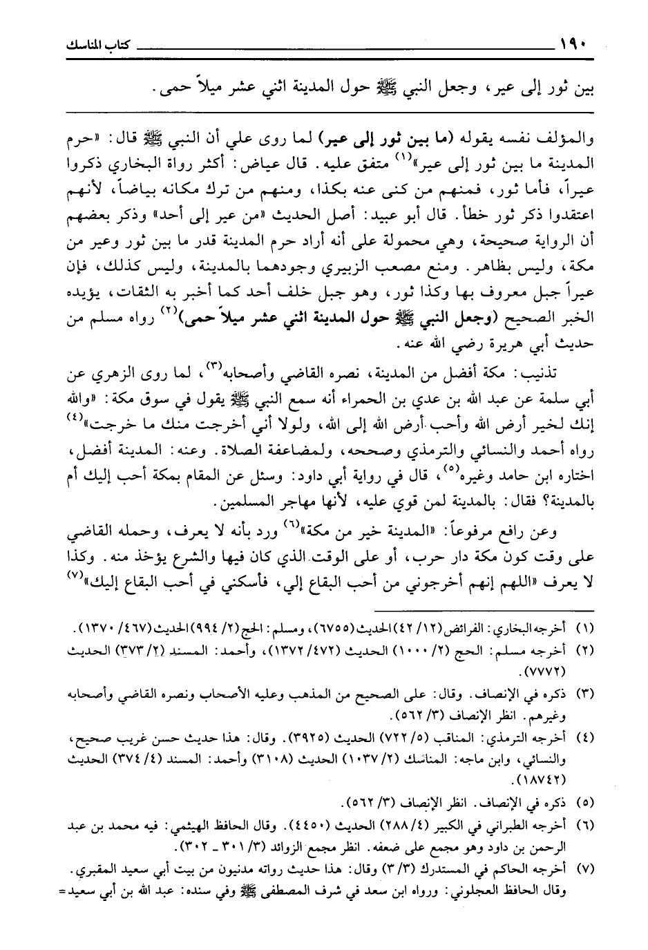 (مَا بَيْنَ ثَوْرٍ إِلَى عَيْرٍ) لِمَا رَوَى عَلَيٌّ أَنَّ النَّبِيَّ - صَلَّى اللَّهُ عَلَيْهِ وَسَلَّمَ - قَالَ: «حَرَمُ الْمَدِينَةِ مَا بَيْنَ ثَوْرٍ إِلَى عَيْرٍ» . مُتَّفَقٌ عَلَيْهِ. قَالَ عِيَاضٌ: أَكْثَرُ رُوَاةِ الْبُخَارِيِّ ذَكَرُوا عَيْرًا، فَأَمَّا ثَوْرٌ، فَمِنْهُمْ مَنْ كَنَّى عَنْهُ بِكَذَا، وَمِنْهُمْ مَنْ تَرَكَ مَكَانَهُ بَيَاضًا، لِأَنَّهُمُ اعْتَقَدُوا ذِكْرَ ثَوْرٍ خَطَأً قَالَ أَبُو عُبَيْدٍ: أَصْلُ الْحَدِيثِ «مِنْ عَيْرٍ إِلَى أُحُدٍ» وَذَكَرَ بَعْضُهُمْ أَنَّ الرِّوَايَةَ صَحِيحَةٌ، وَهِيَ مَحْمُولَةٌ عَلَى أَنَّهُ أَرَادَ، حَرَمُ الْمَدِينَةِ قَدْرُ مَا بَيْنَ ثَوْرٍ وَعَيْرٍ مِنْ مَكَّةَ، وَلَيْسَ بِظَاهِرٍ، وَمَنَعَ مُصْعَبٌ الزُّبَيْرِيُّ وَجُودَهُمَا بِالْمَدِينَةِ، وَلَيْسَ كَذَلِكَ فَإِنَّ عَيْرًا جَبَلٌ مَعْرُوفٌ بِهَا وَكَذَا ثَوْرٌ، وَهُوَ جَبَلٌ خَلْفَ أُحُدٍ كَمَا أَخْبَرَ بِهِ الثِّقَاتُ، يُؤَيِّدُهُ الْخَبَرُ الصَّحِيحُ ( «وَجَعَلَ النَّبِيُّ - صَلَّى اللَّهُ عَلَيْهِ وَسَلَّمَ - حَوْلَ الْمَدِينَةِ اثْنَيْ عَشَرَ مِيلًا حِمًى» . رَوَاهُ مُسْلِمٌ مِنْ حَدِيثِ أَبِي هُرَيْرَةَ - رَضِيَ اللَّهُ عَنْهُ -.